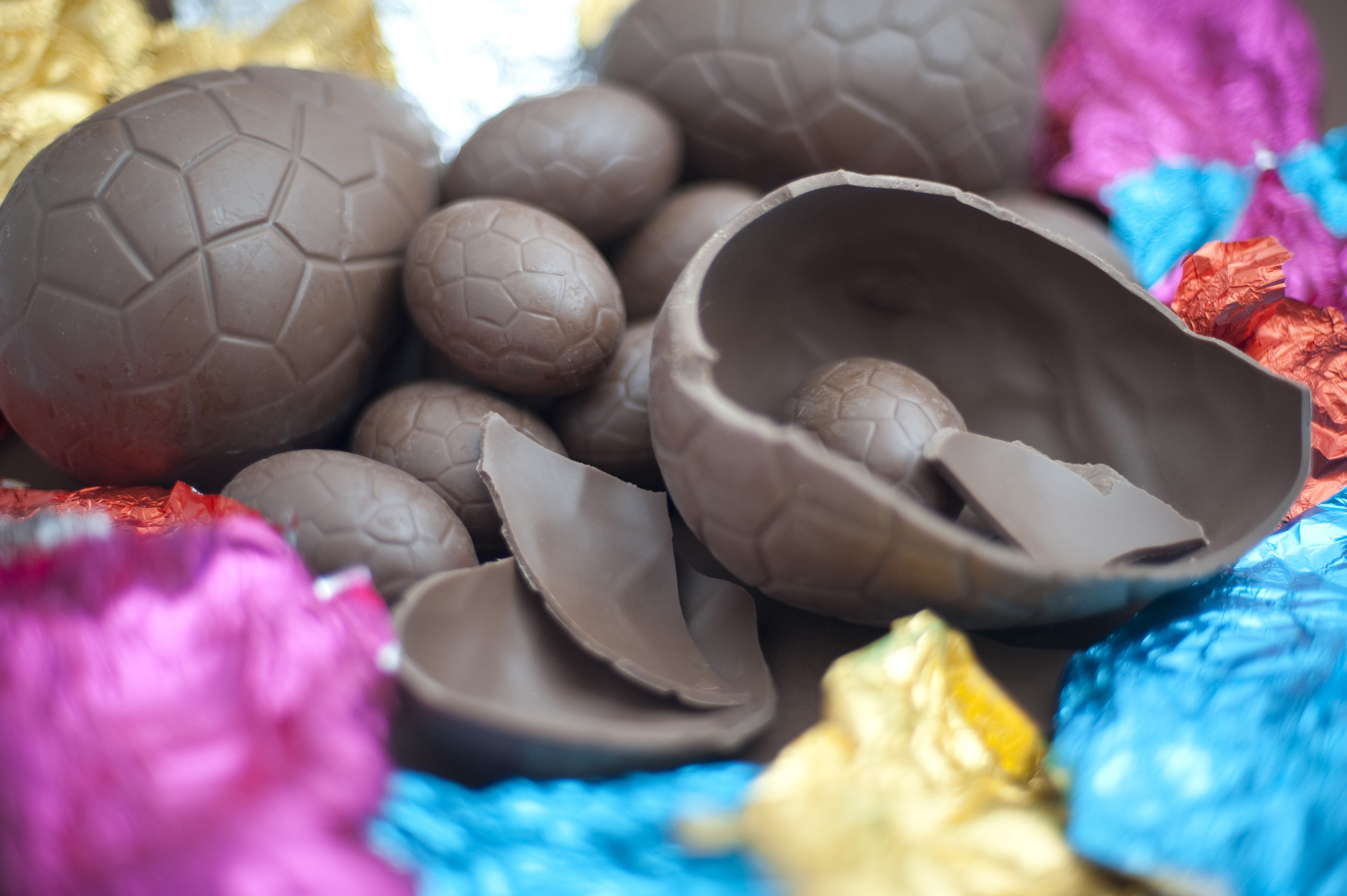 Easter Sunday treat with opened cracked and broken chocolate Easter eggs lying amongst their colourful foil wrappers