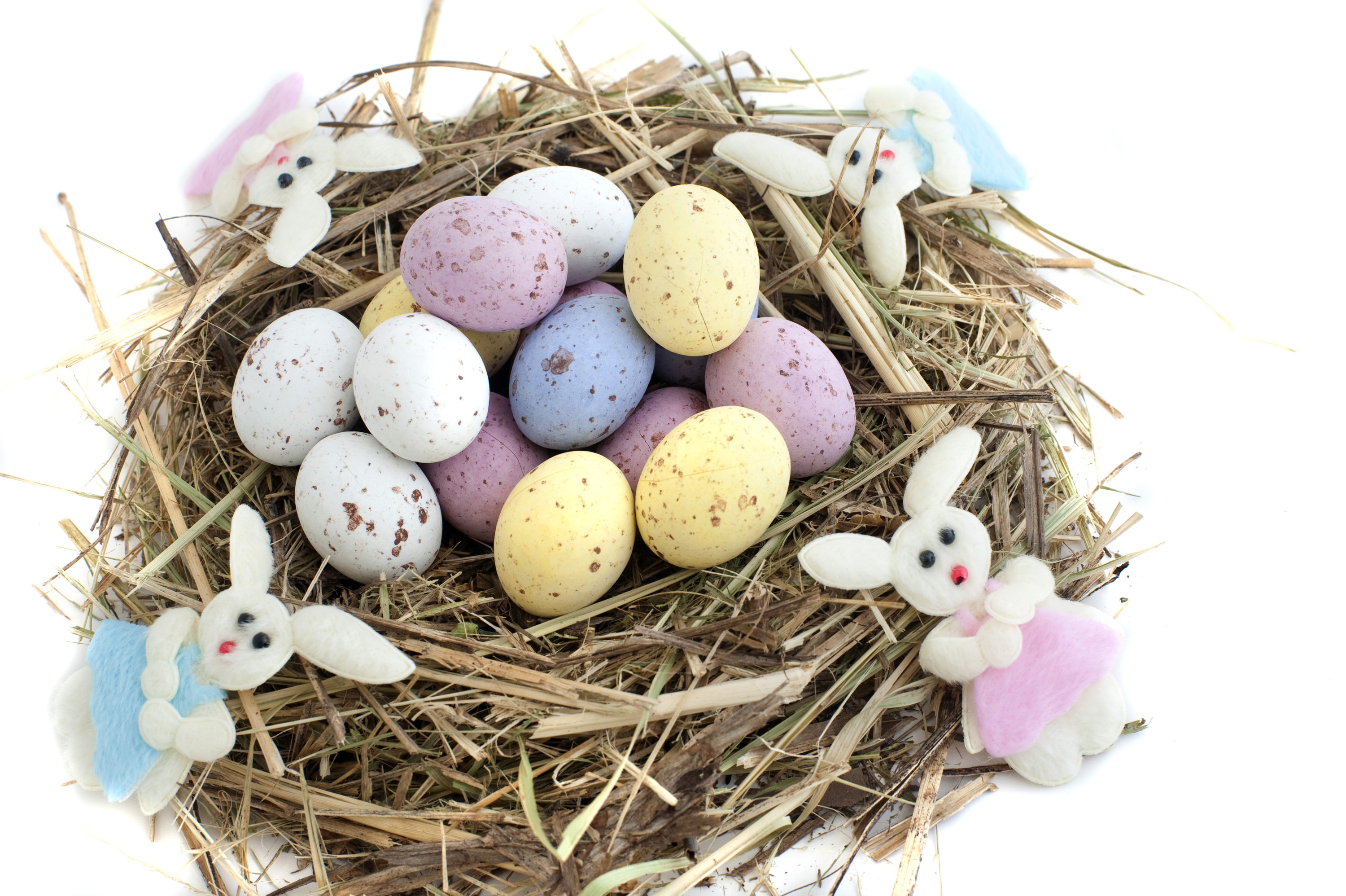 Straw nest filled with colourful sugar candy Easter Eggs and decorated with four Easter bunnies