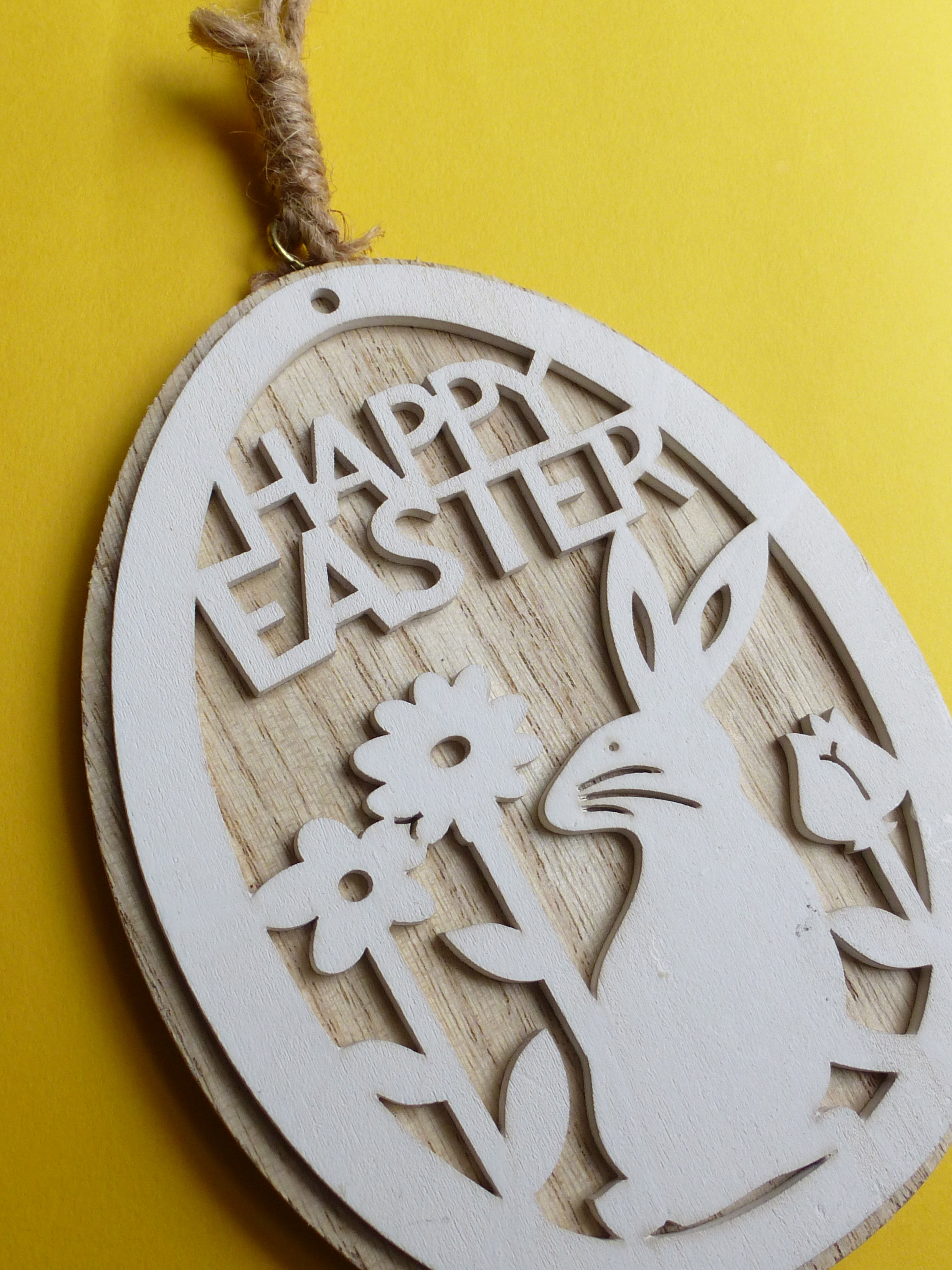 Happy Easter carved wooden pendant with rabbit and flowers, viewed in close-up on yellow background