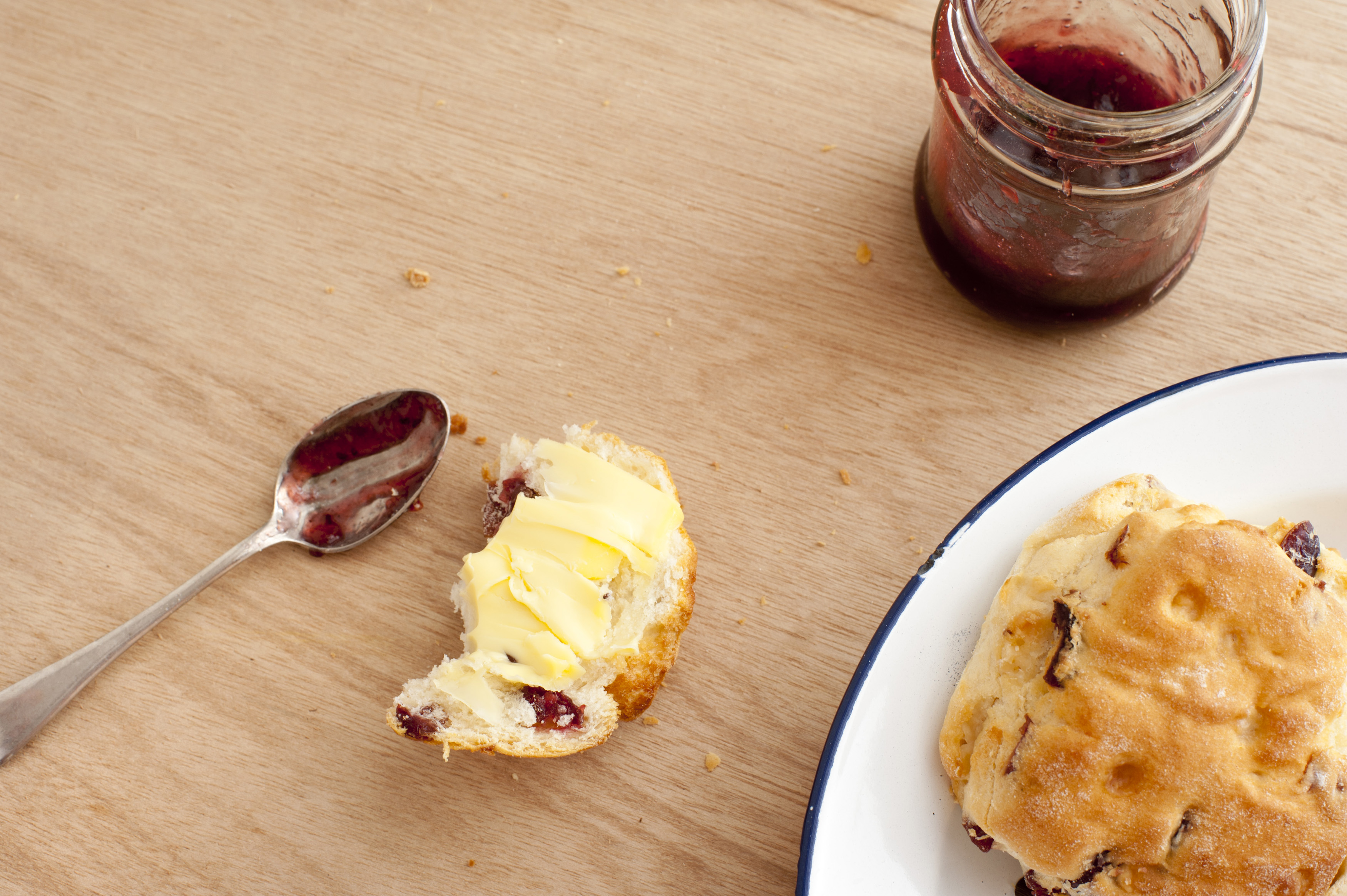 First person perspective on half eaten buttered crispy scone biscuits, spoon, plate and jam in plate over light brown wooden table