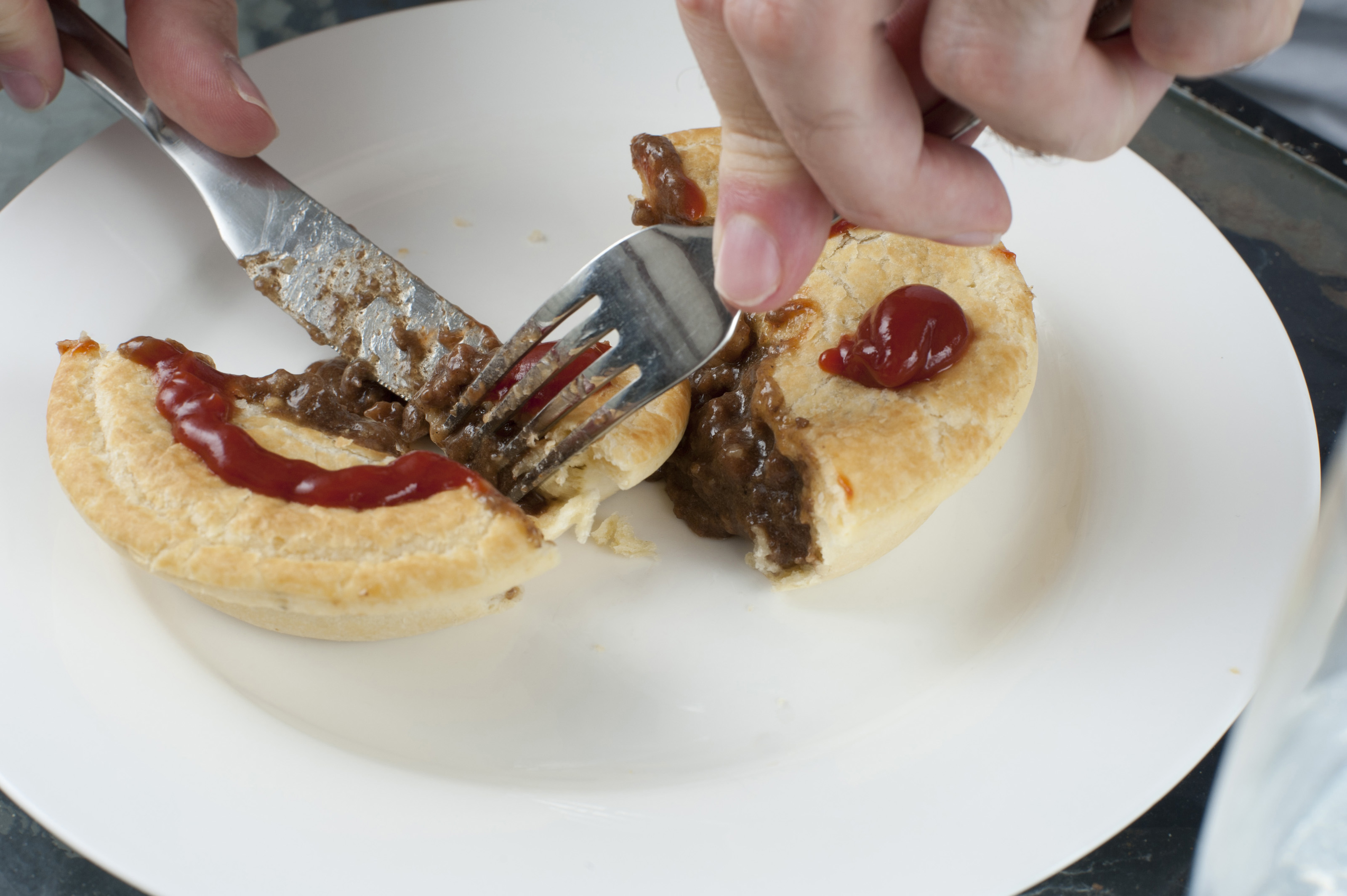 Keywords: food, pie, meat pie, sauce, cutting, nife and fork, plate, meal, junk food, mince, tomato sauce, ketchup