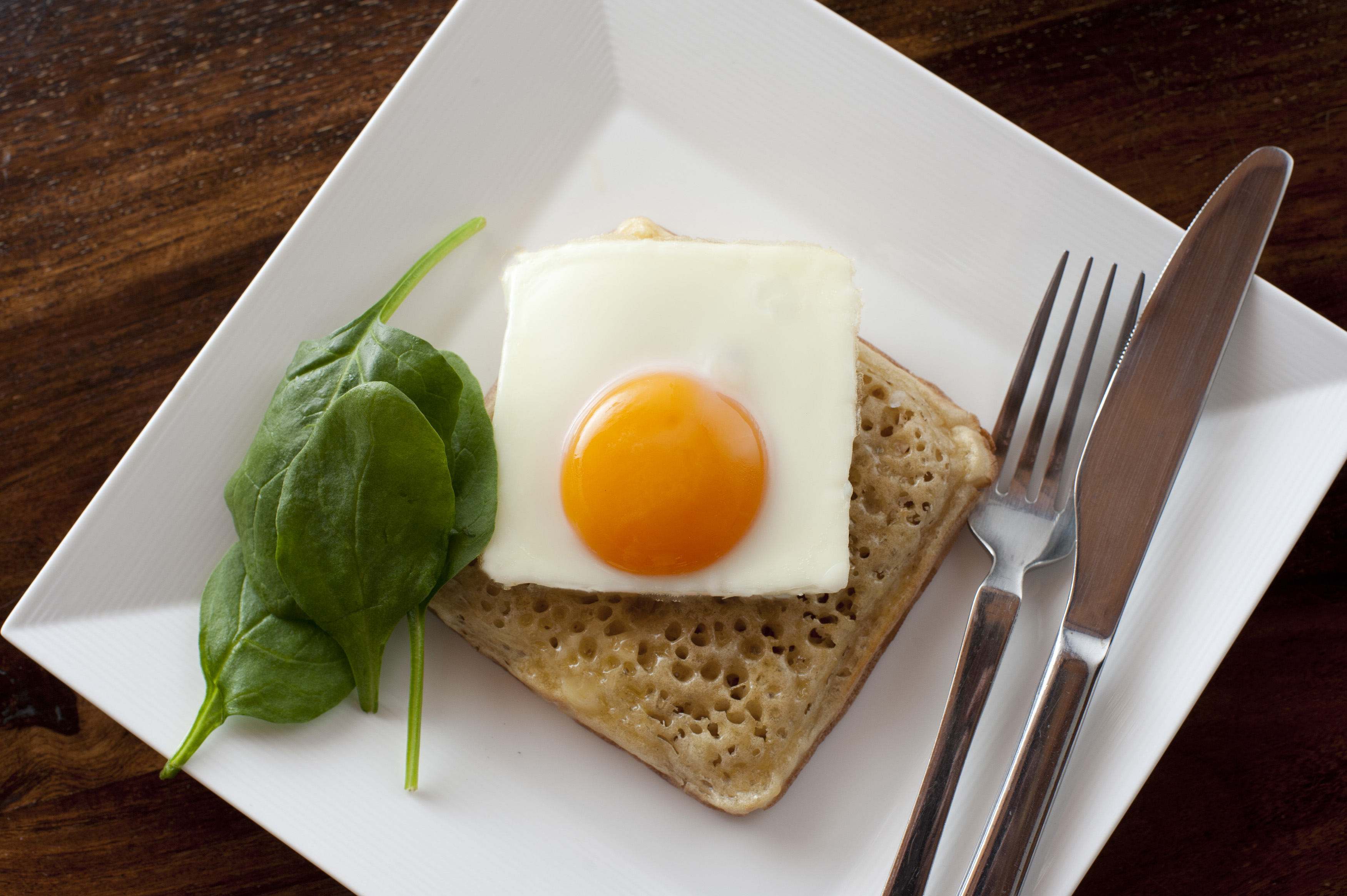 Keywords: breakfast, crumpet, egg, fried, leaves, spinach, square, wheat, food, serving, above, plate, shape, cutlery