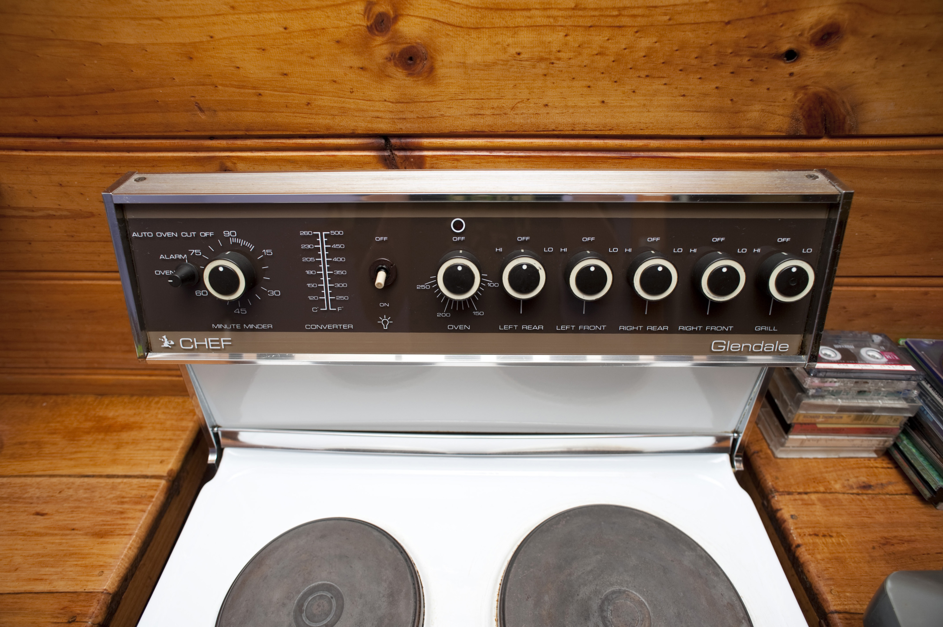 Keywords: kitchen, equipment, stove, electrical, domestic, household, cooking, appliance, oven, controls, knobs, hotplates, kitchenware, wooden, background, above, white, metal, dials, energy