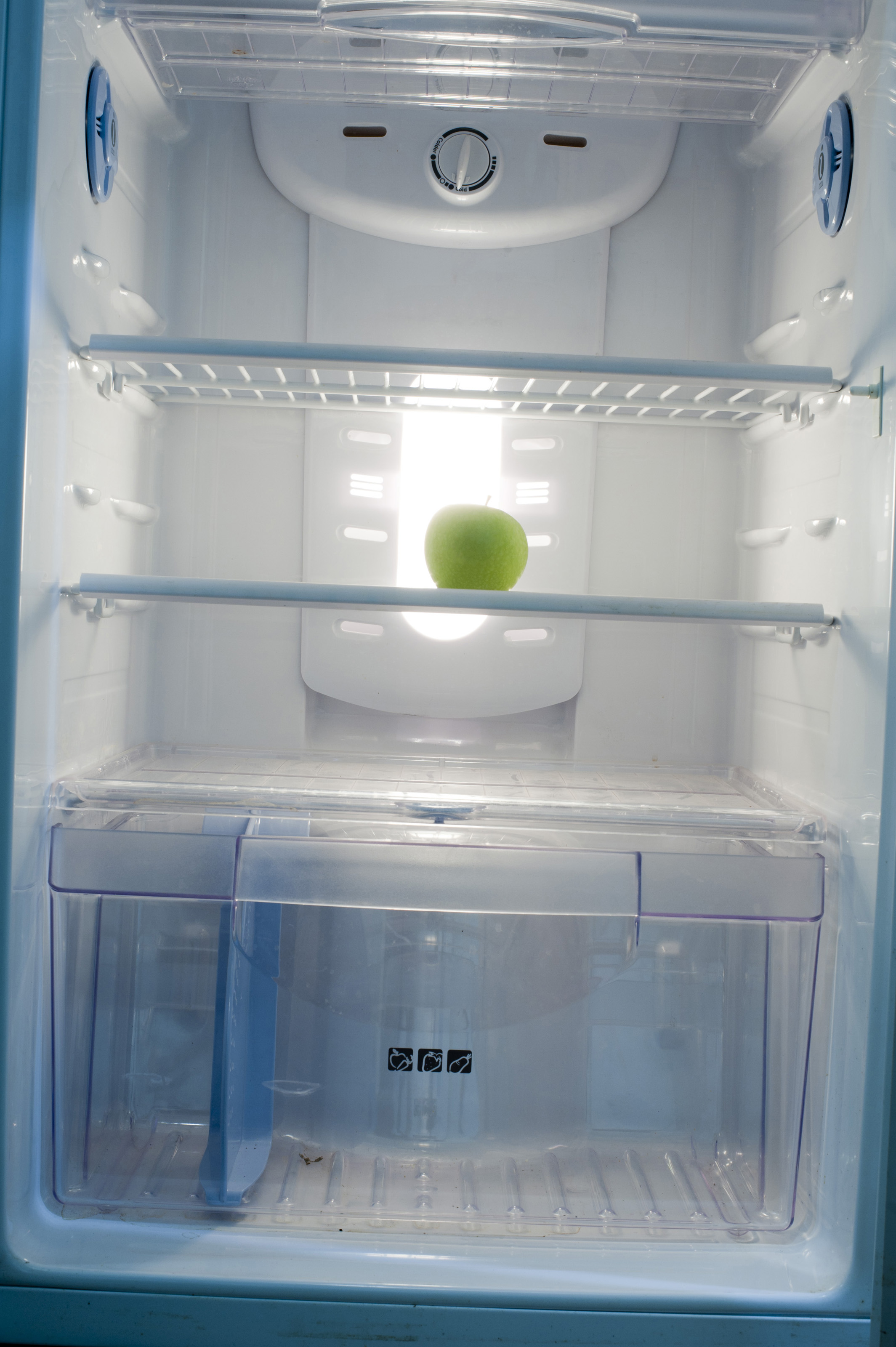 fridge empty but for a lone apple, concept of out of food, nothing to eat of a crash diet