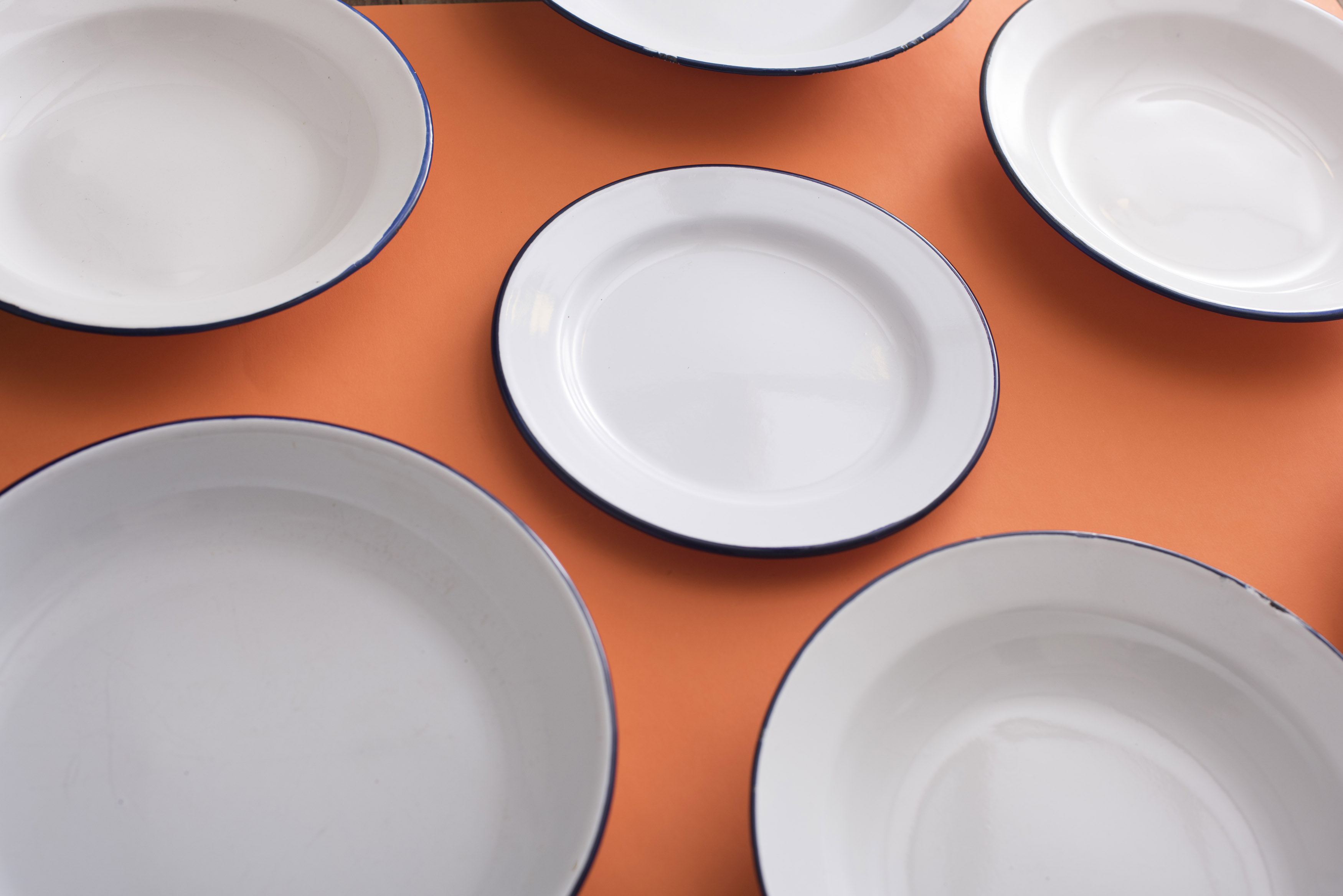17154 Plain white enamel plates on orange - this image by freefoodphotos is licensed under a Creative Commons Attribution 3.0 Unported License.