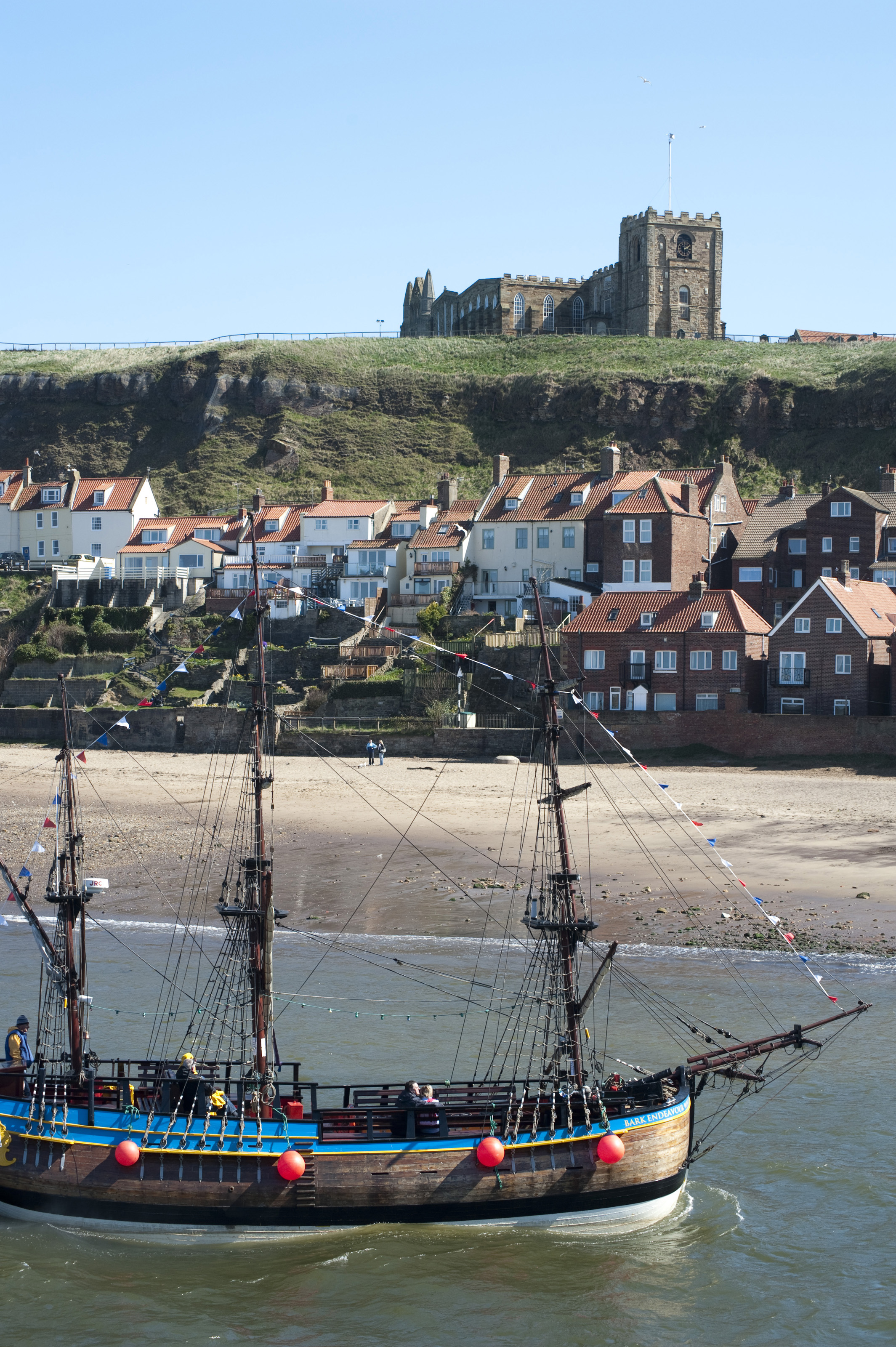 Keywords: wooden, travel, tourist, beach, ship, coastal, bark, historical, nautical, marine, england, sailing, cruise, replica, masts, tourist attraction, seafront, endeavour, whitby, north yorkshire, captain cook, scale model, st marys church, tate hill, full size