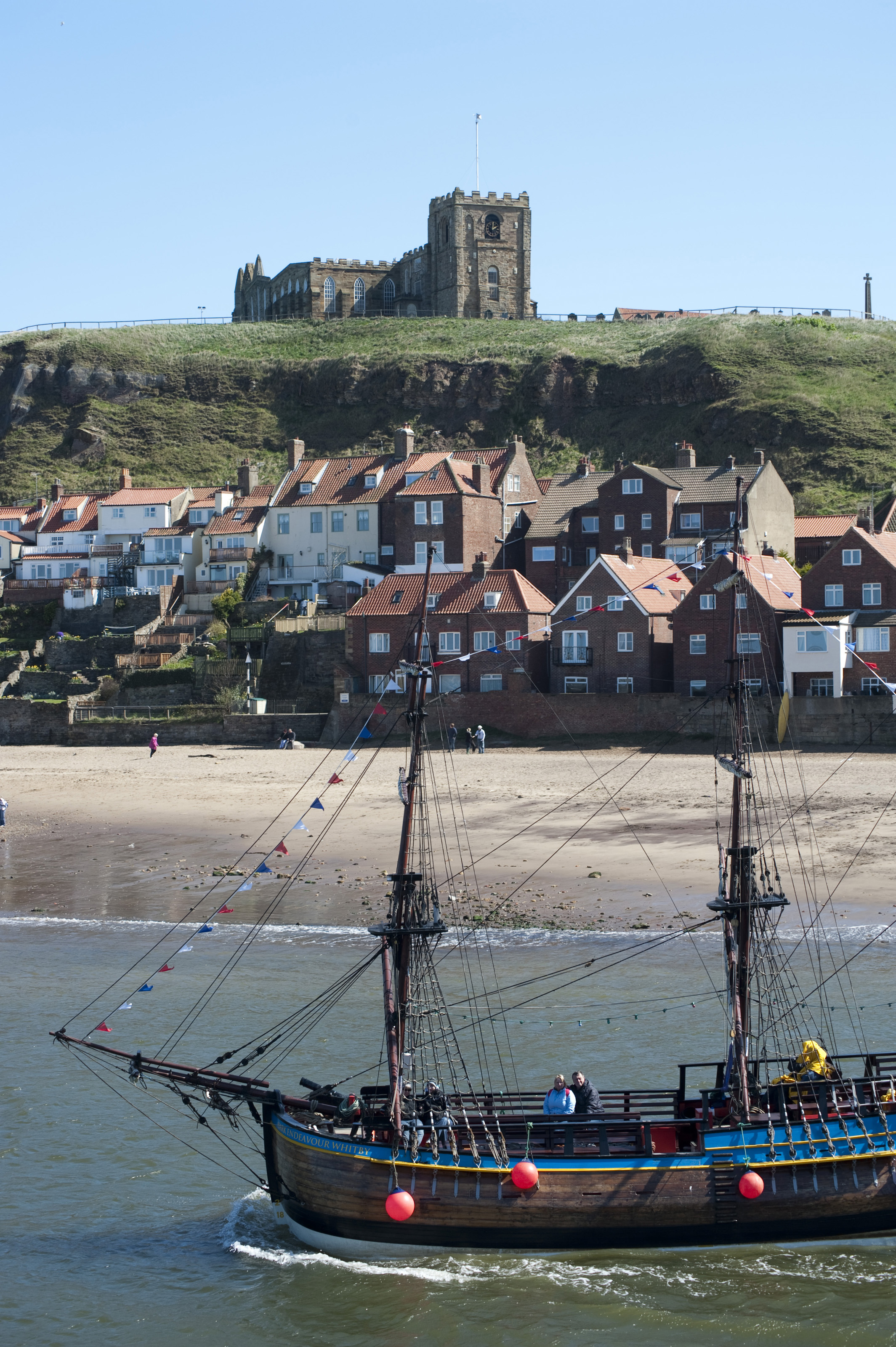 Keywords: whitby, north yorkshire, england, wooden, tourism, ship, coast, view, bark, sailing, replica, masts, endeavour, bowsprit, captain cook, scale model, st marys church, full size, cruise, travel, sightseeing, tate hill, nautical, marine, historical