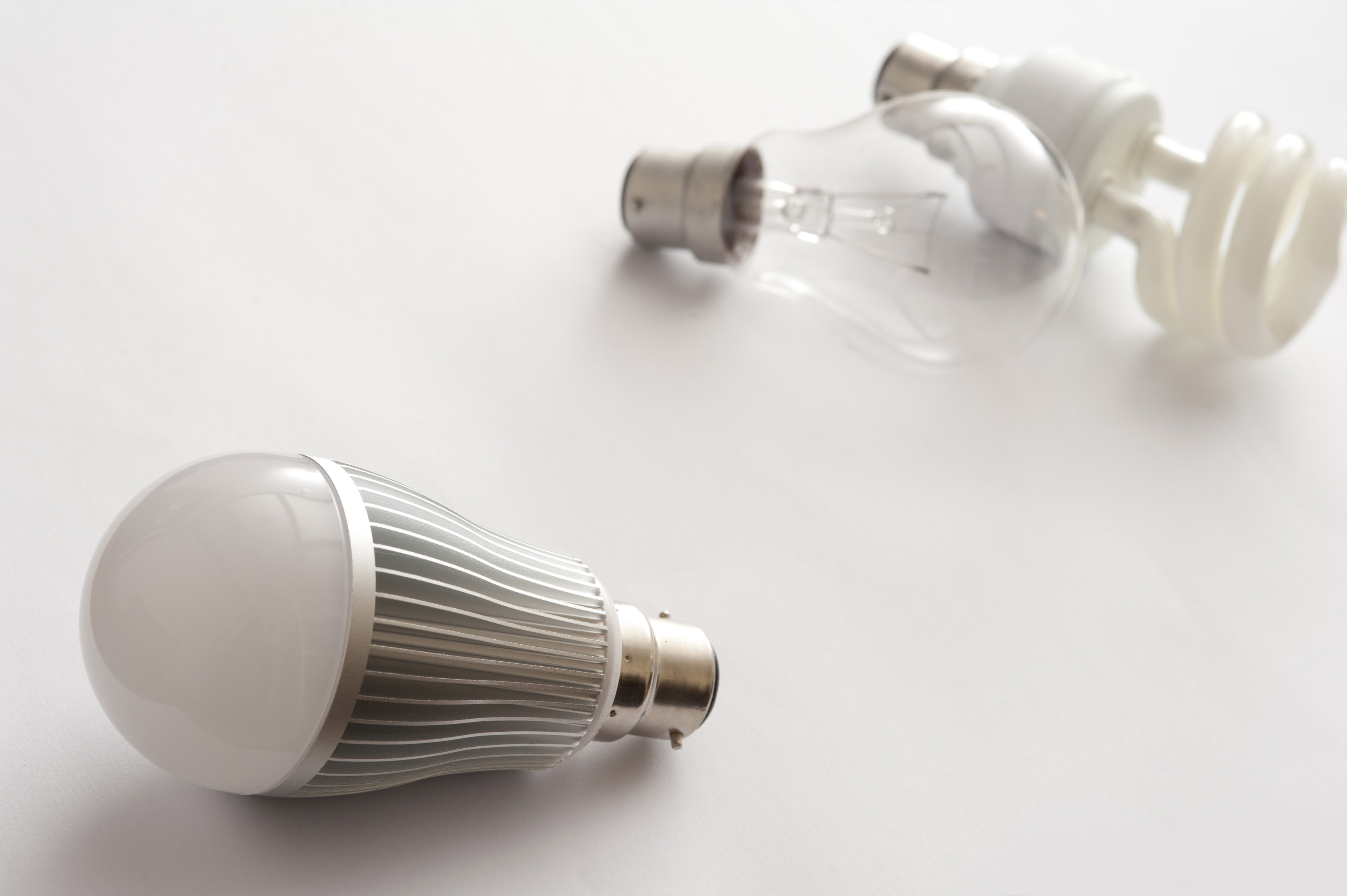 Three generations of light bulbs, with LED energy efficient lamp close-up in focus and incandescent with fluorescent lamps blurred in background on white surface