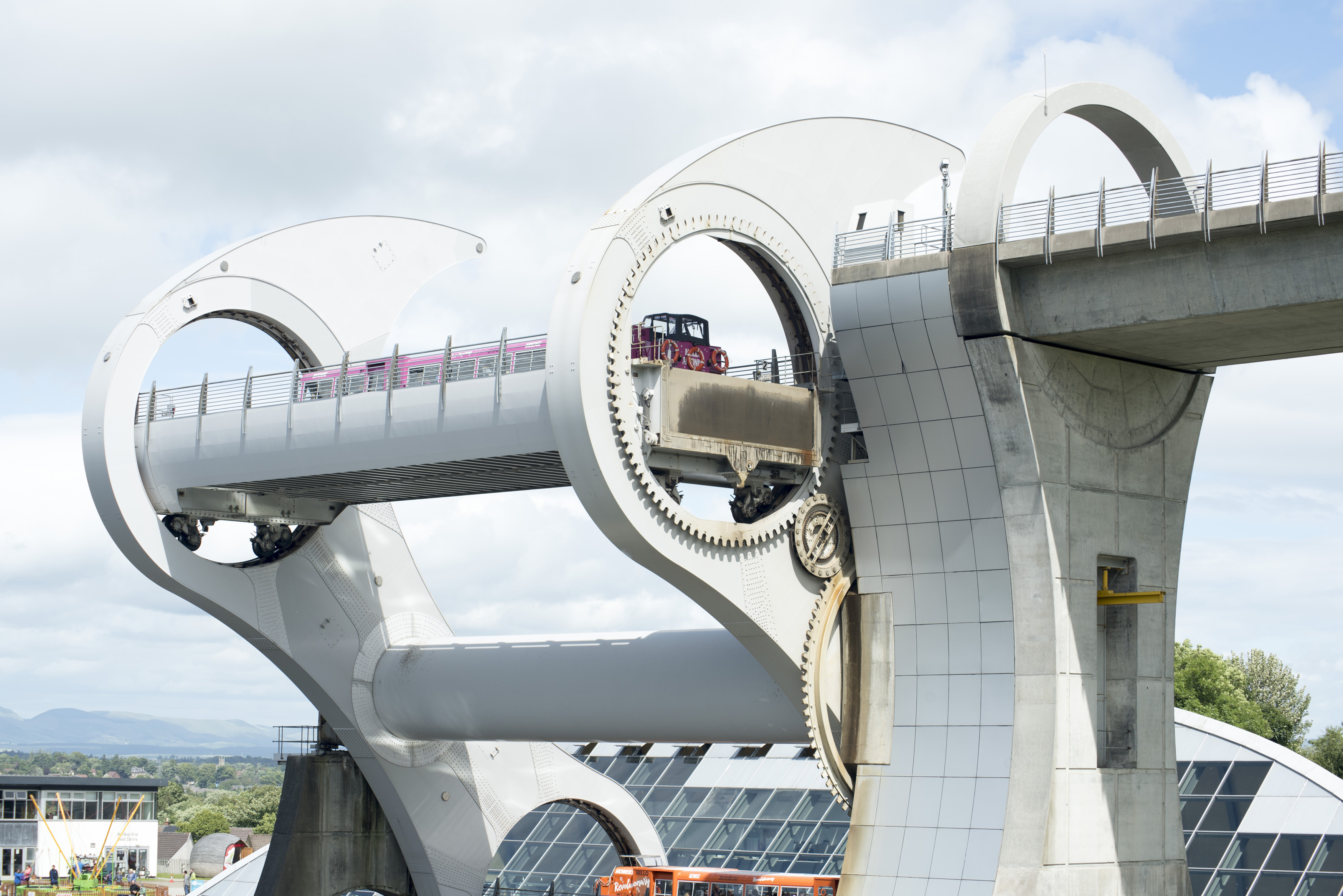 Keywords: boat lift, canal, engineering, falkirk wheel, scotland, transportation, nobody, outdoors, europe, partly cloudy, boat, moving, raised, up, changing