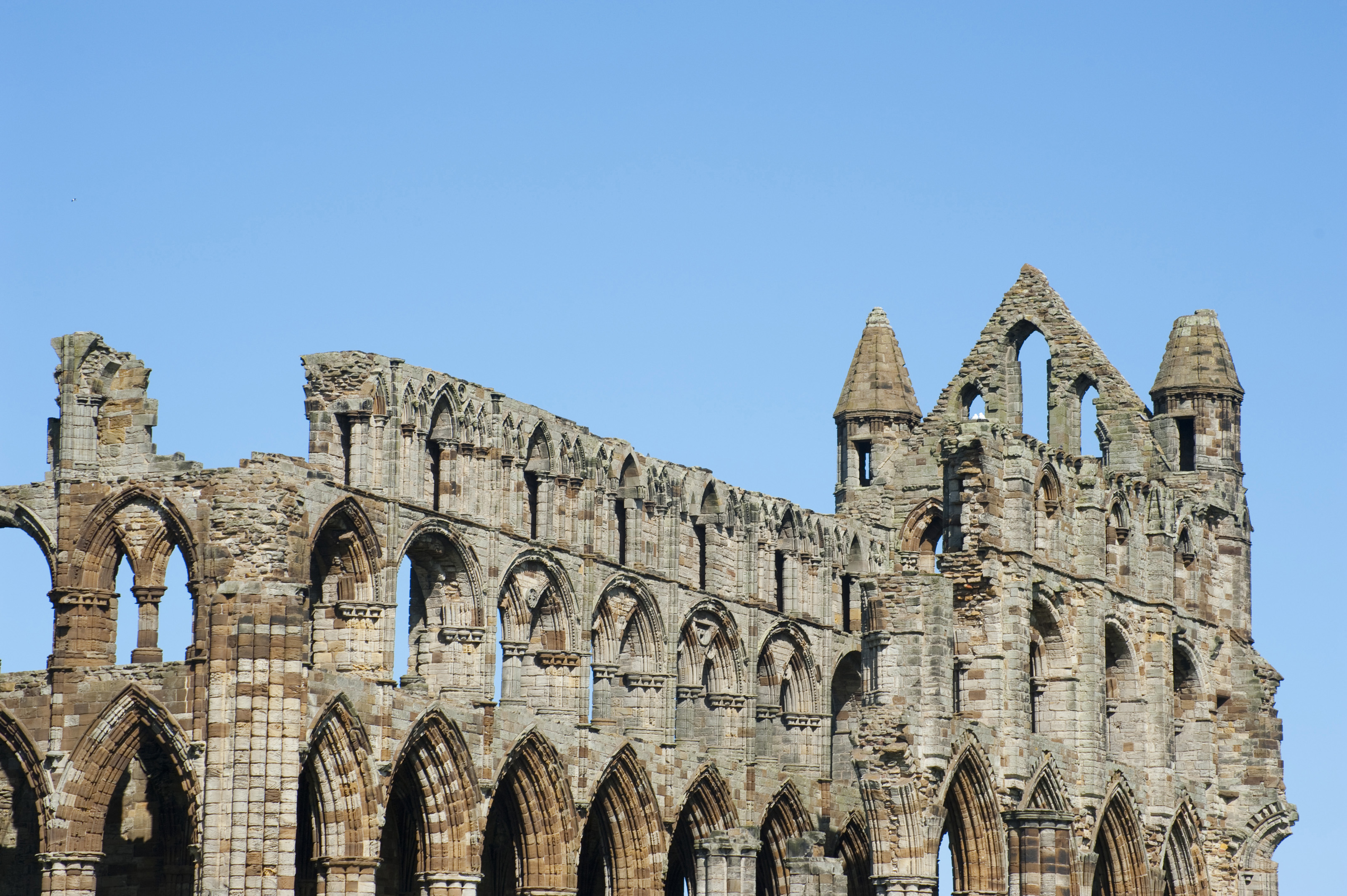 Whitby Abbey ruins detail showing the multiple stone arches of this medieval Benedictine monastery that was destroyed under King Henry VIII