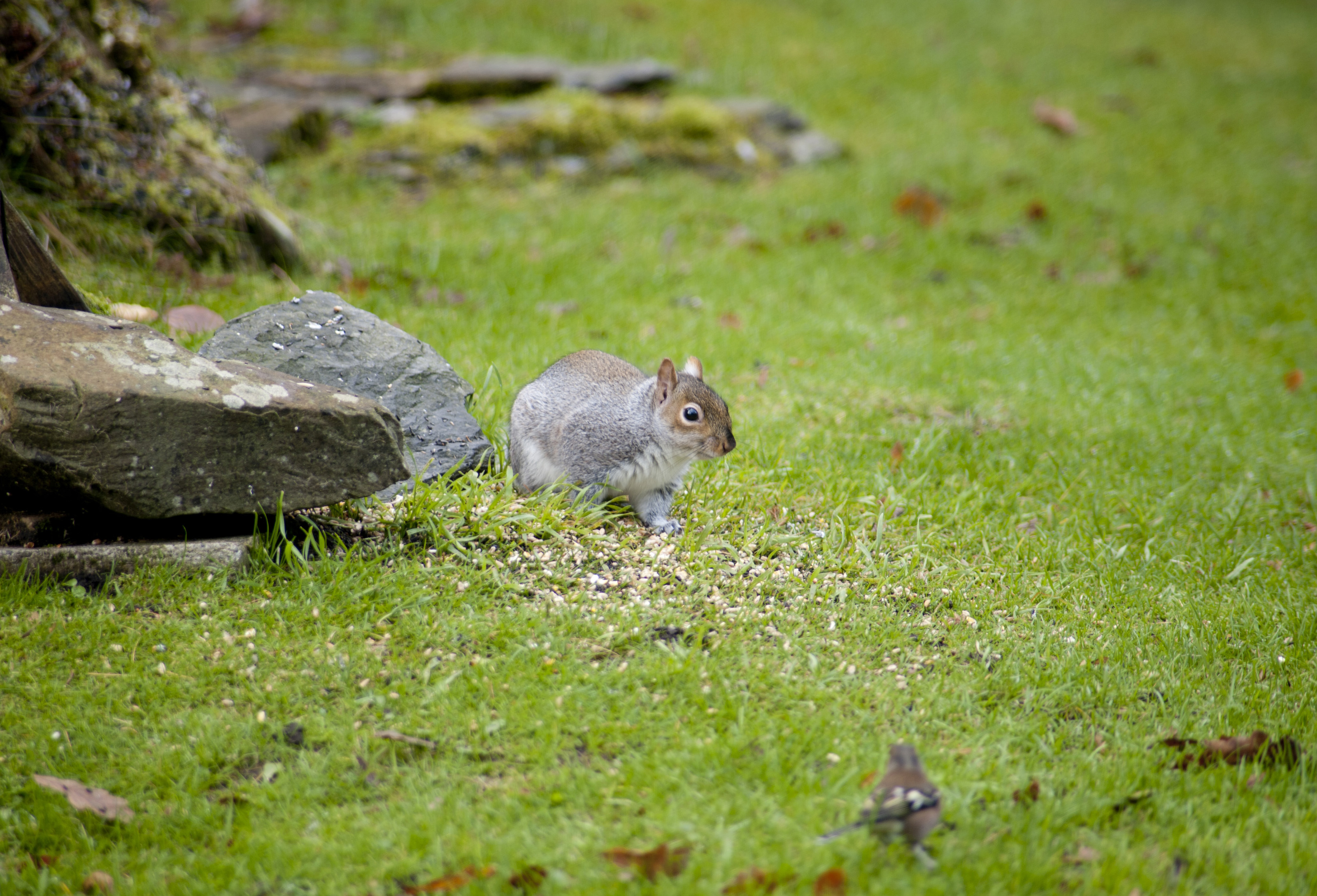 Grey squirrel eating seeds in a garden that have been scattered on a lawn near rocks keeping a beady eye on the camera
