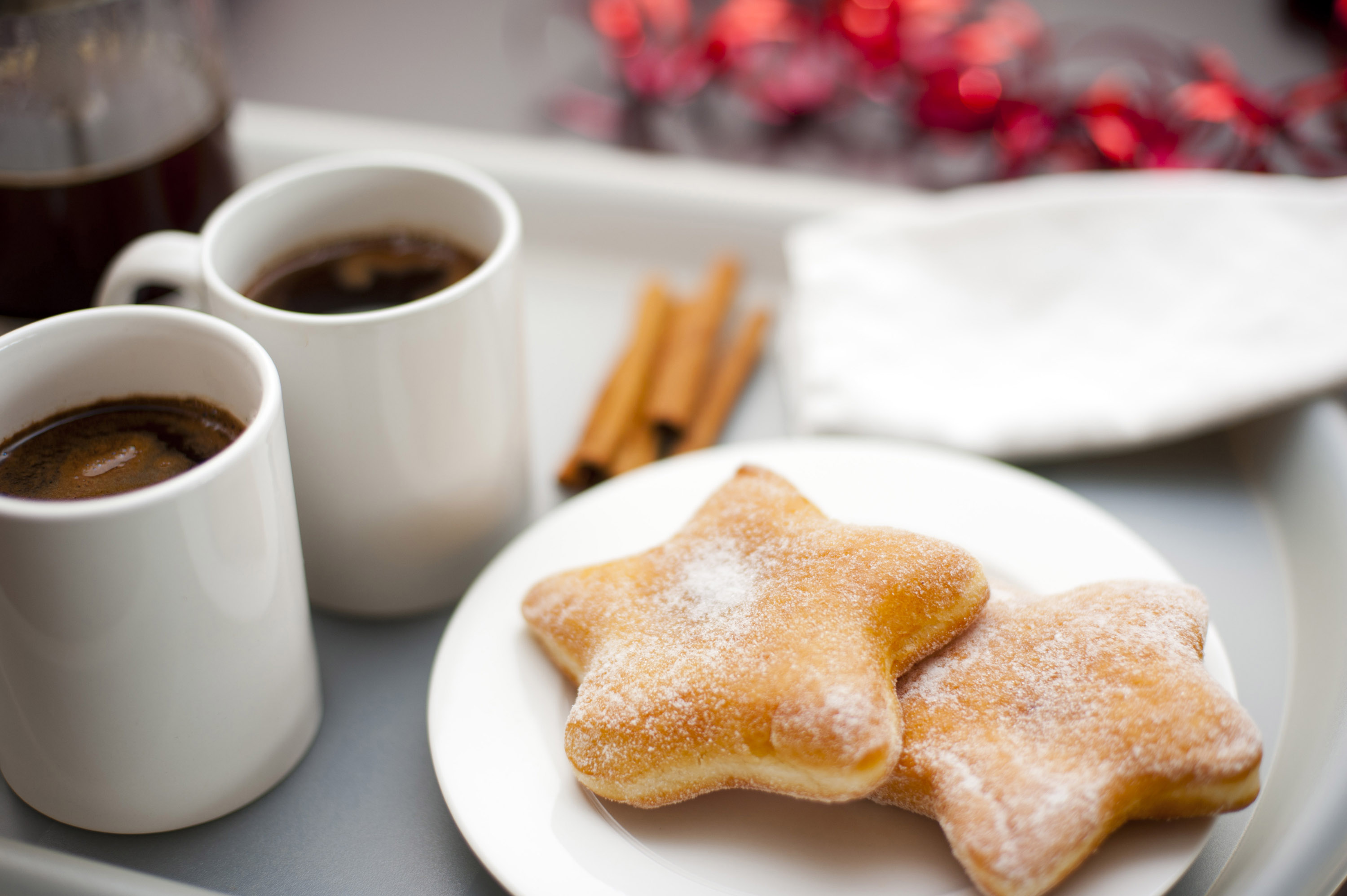 Keywords: beverage, cake, christmas, coffee, coffee break, donuts, doughnuts, festive, food, fried, mugs, shape, star, sugared, xmas