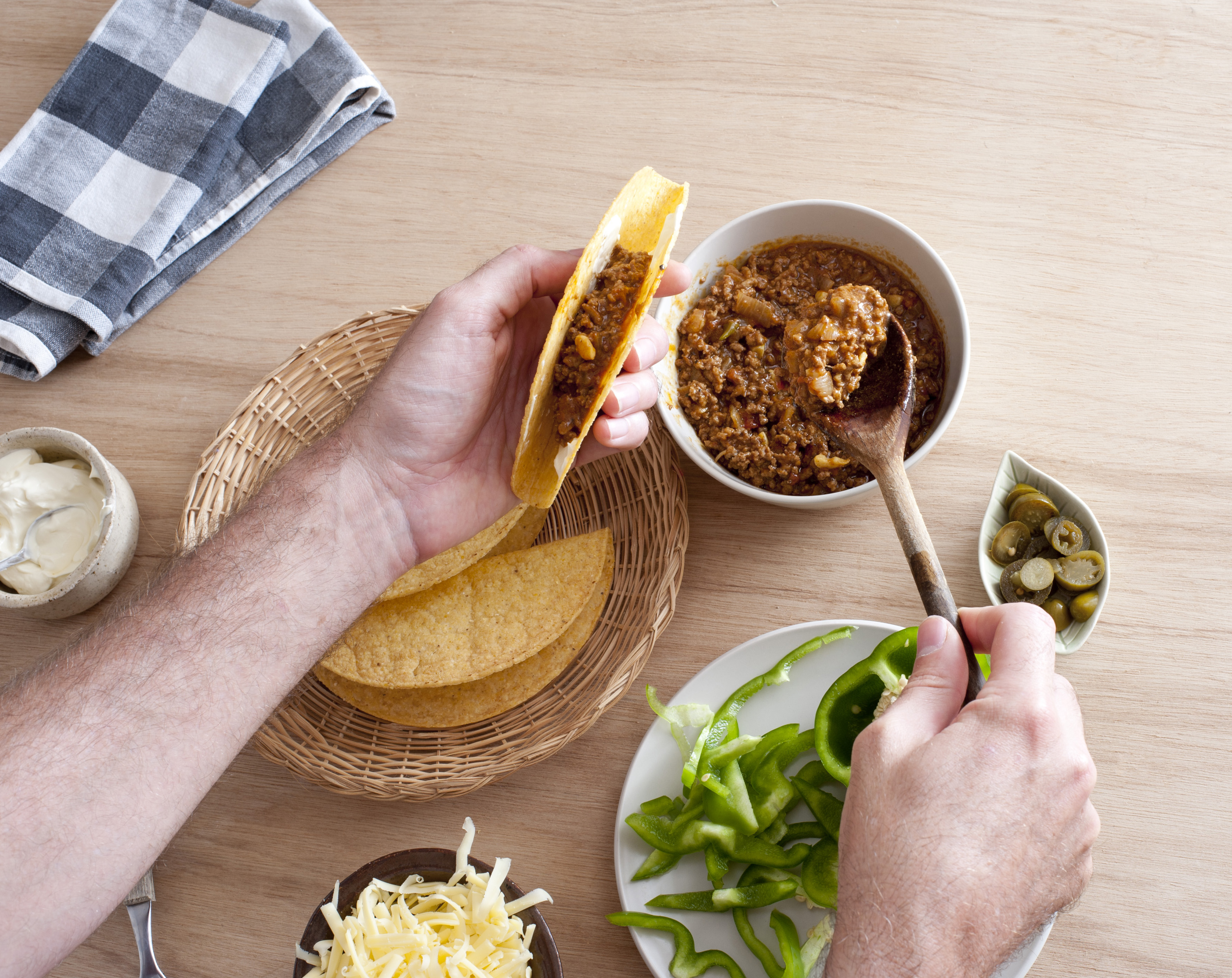 Keywords: food, mexican, preparing, bowl, cheese, ground beef, home made, peppers, shell, tacos, toppings, green, first person perspective, making, filling, on wood