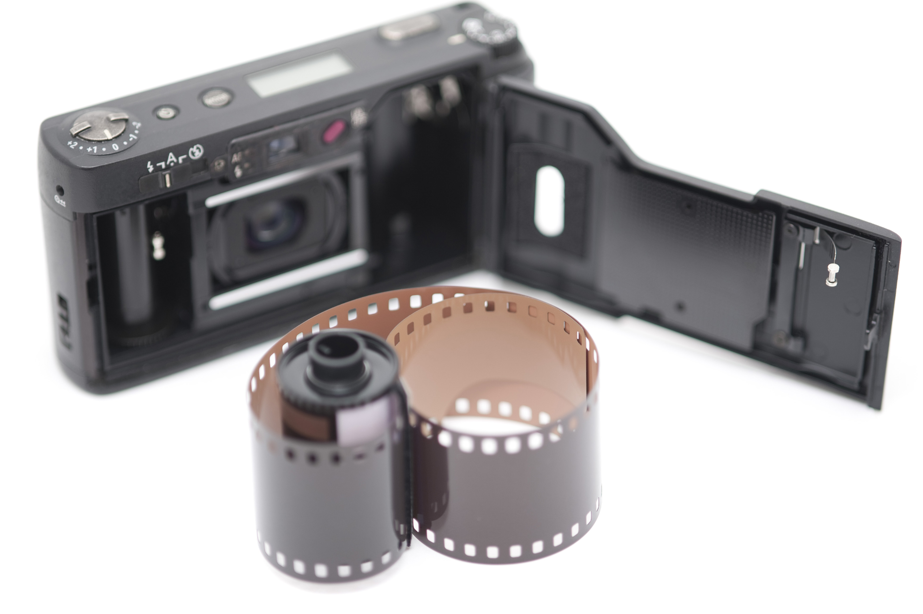 Single exposed roll of film next to compact 35 millimeter pocket camera with open back cover over white background in selective focus