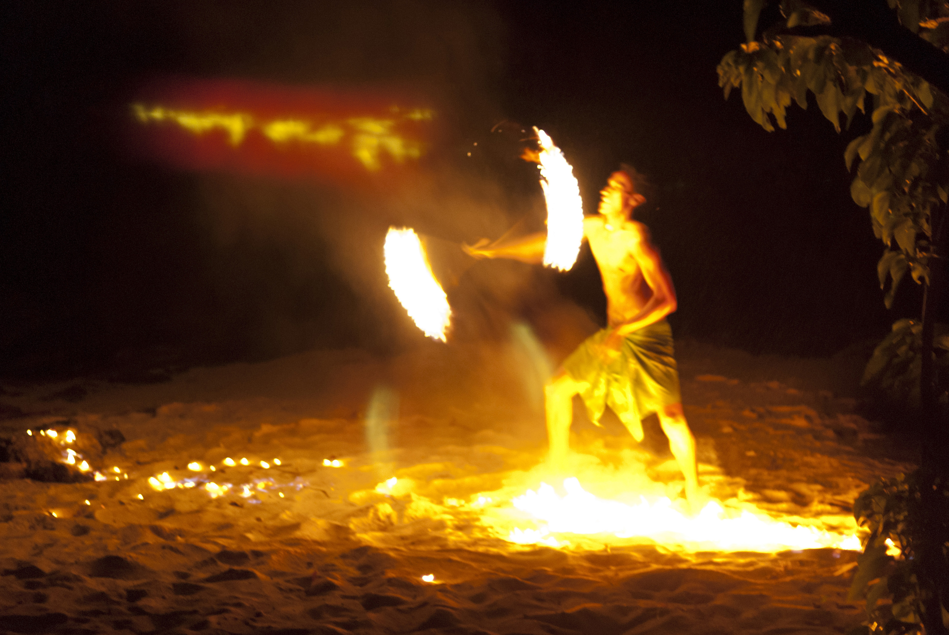 Keywords: fiji, vacation, man, fire, flames, burning, branch, performance, dancing, entertainment, performer, dancer, twirling, fijian, beach