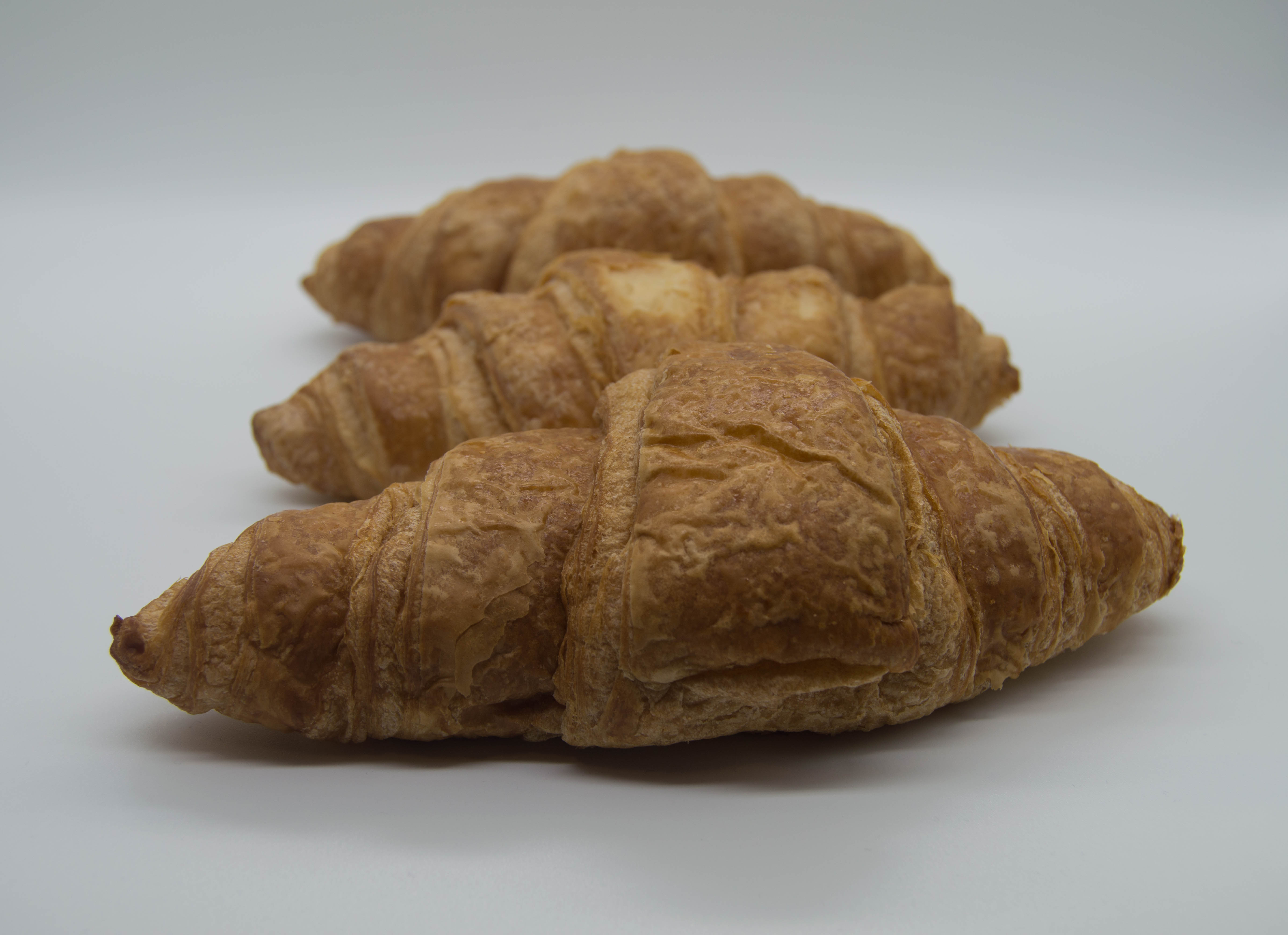 Three croissants in a line with a white background.