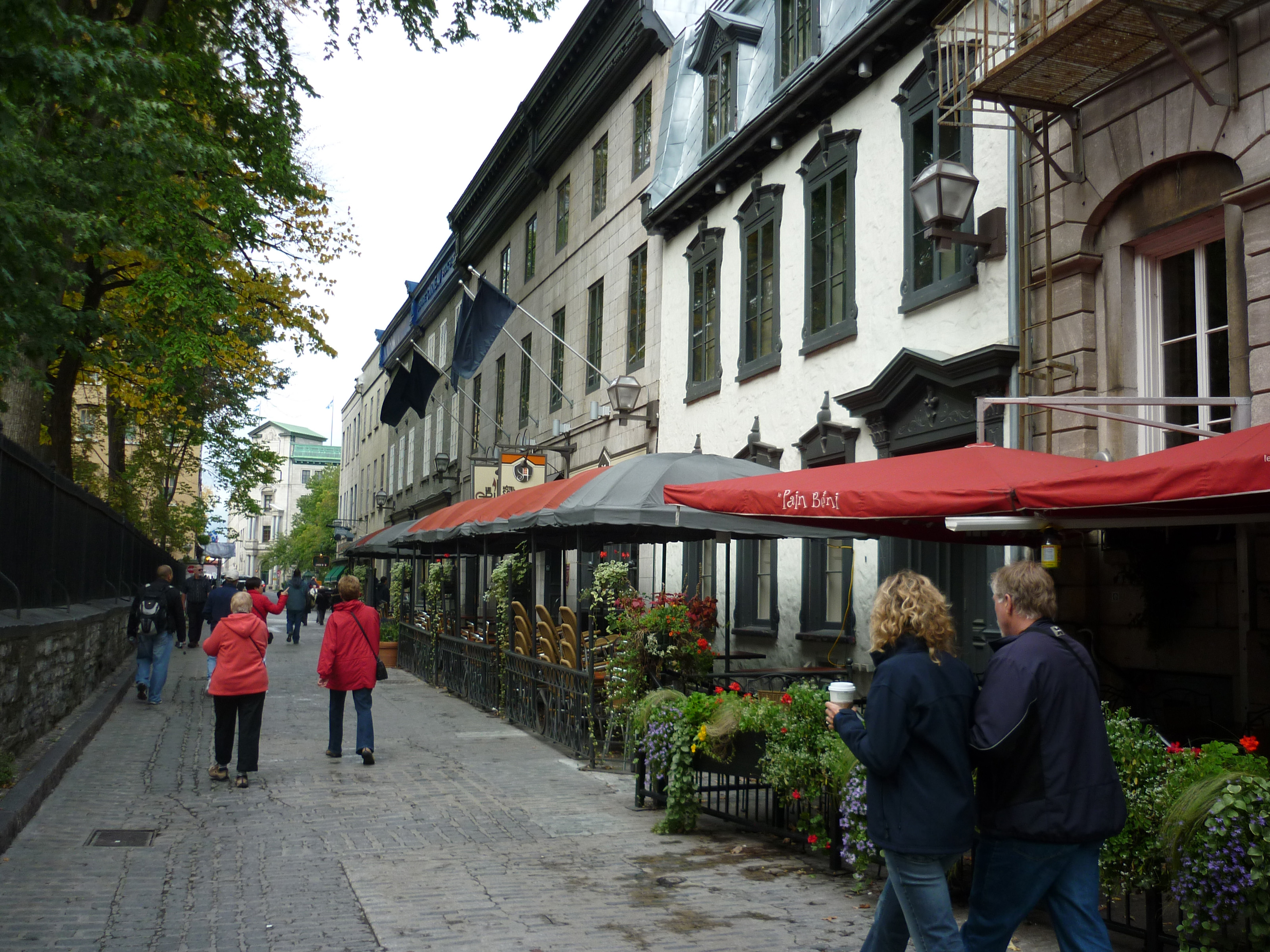 Keywords: street, people, urban, architecture, sidewalk, canada, commercial, french, quebec, umbrellas, travel, scene, lifestyle, historical, buildings