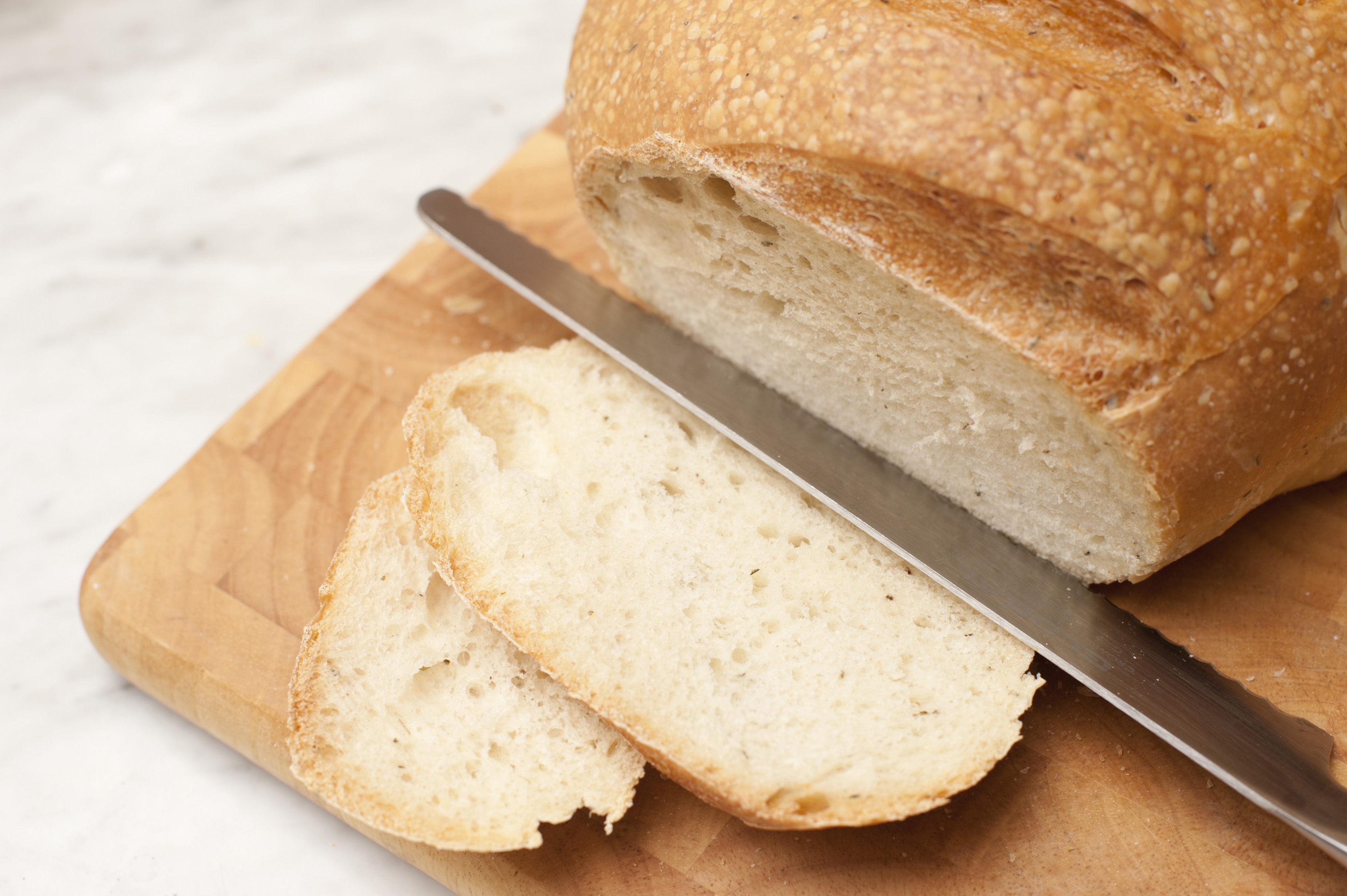 Keywords: bread, carbohydrates, crust, cutting, cutting board, knife, slice, sliced, staple, white bread