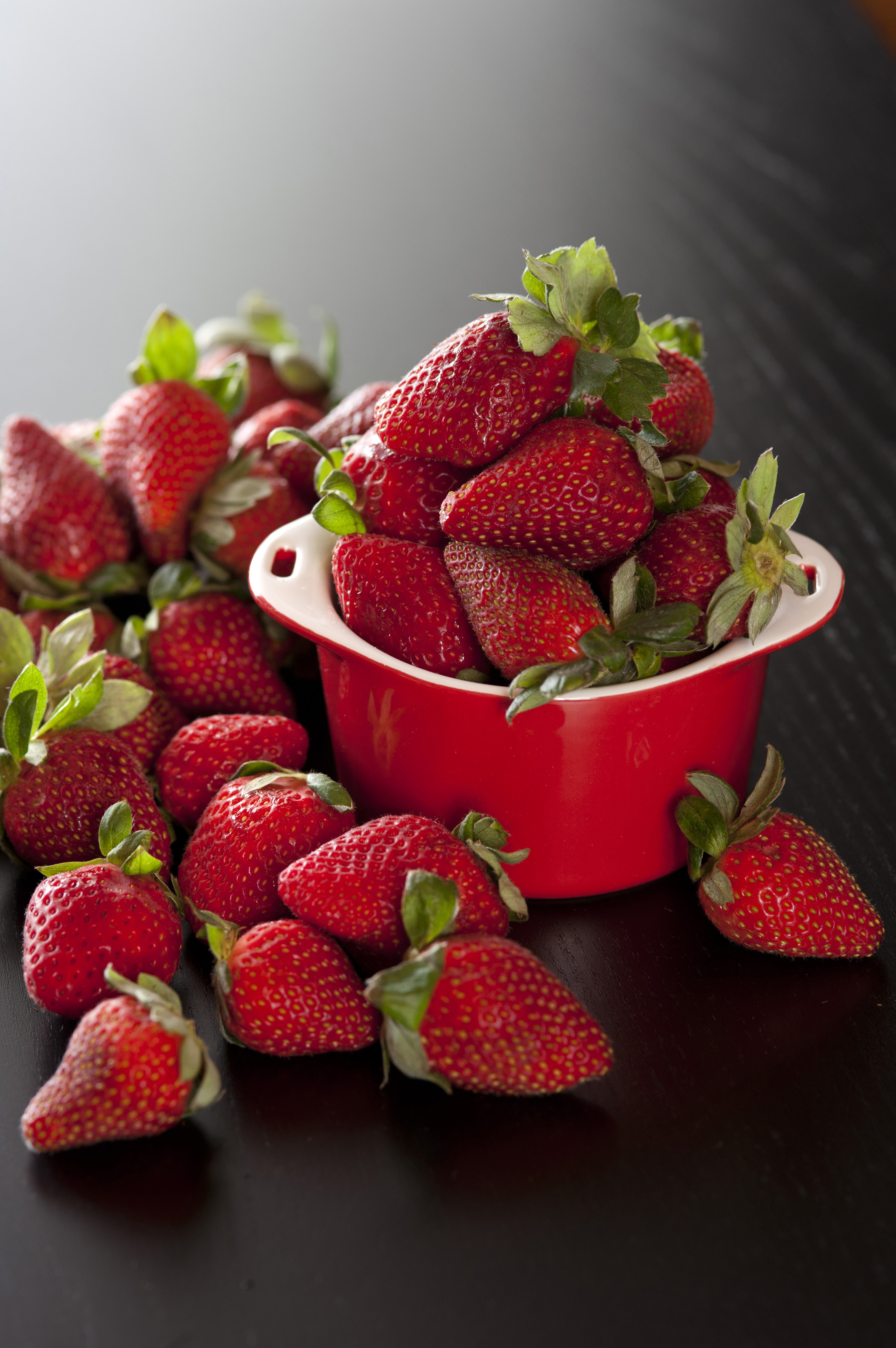 Ripe red strawberries in a small ramekin overflowing onto a dark surface with a highlight behind for copyspace