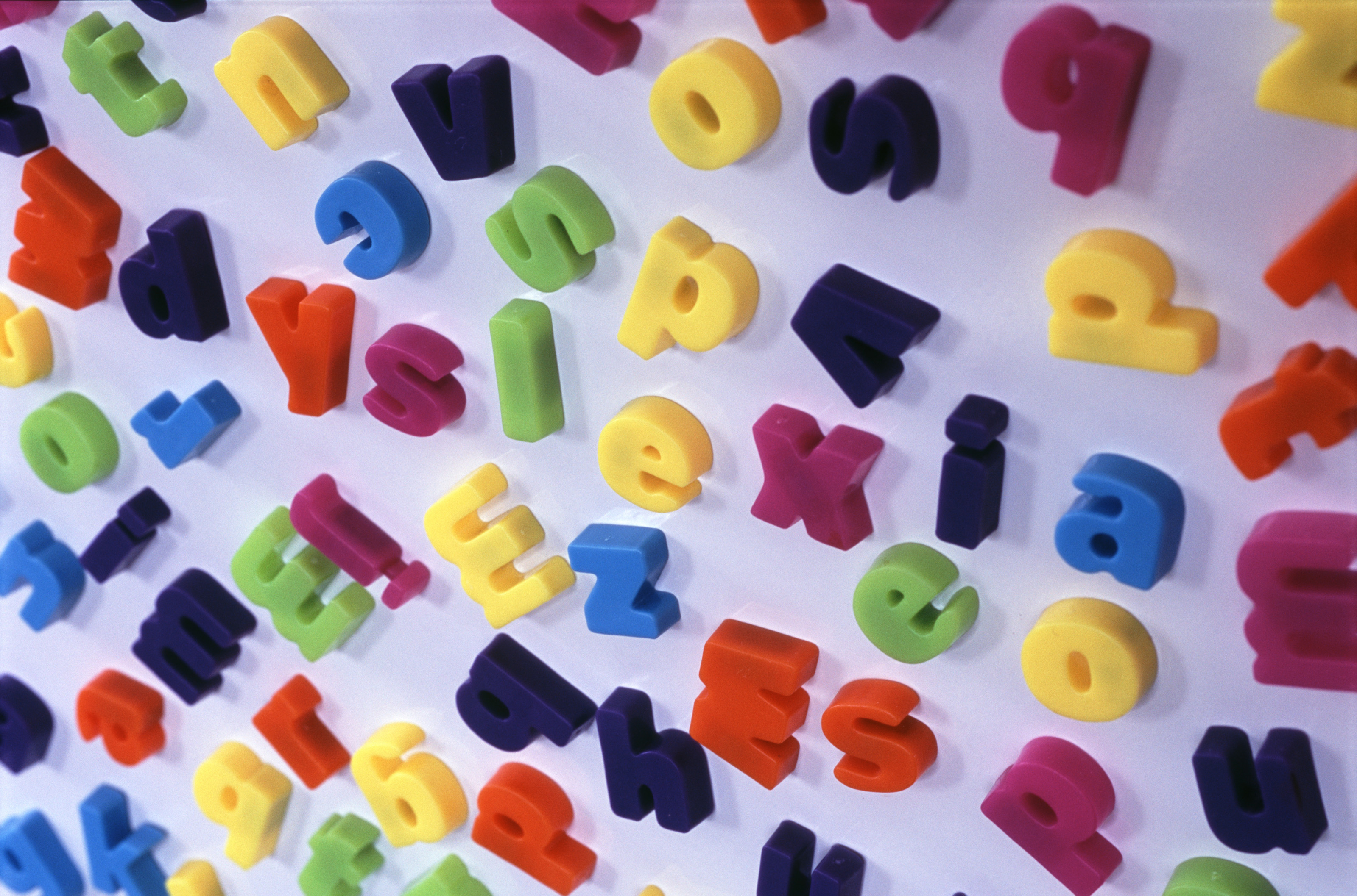 Scattered fridge magnet letters representational of the incomprehensible words seen by a person suffering from dyslexia with the word DYSLEXIA in the centre