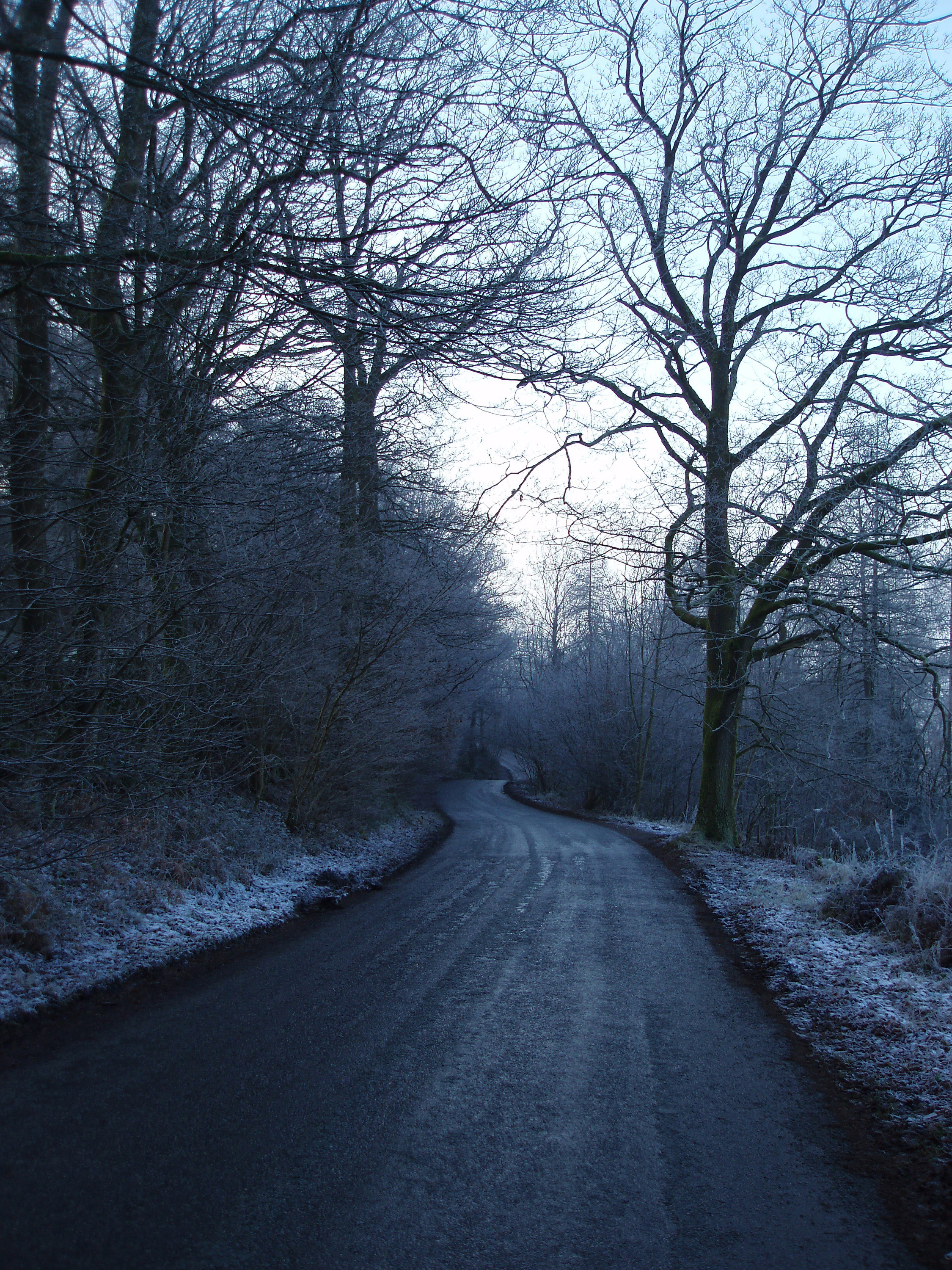 Keywords: frost, cold, winter, ice, cold, road, lane, narrow, single lane, woodland, trees, slippery