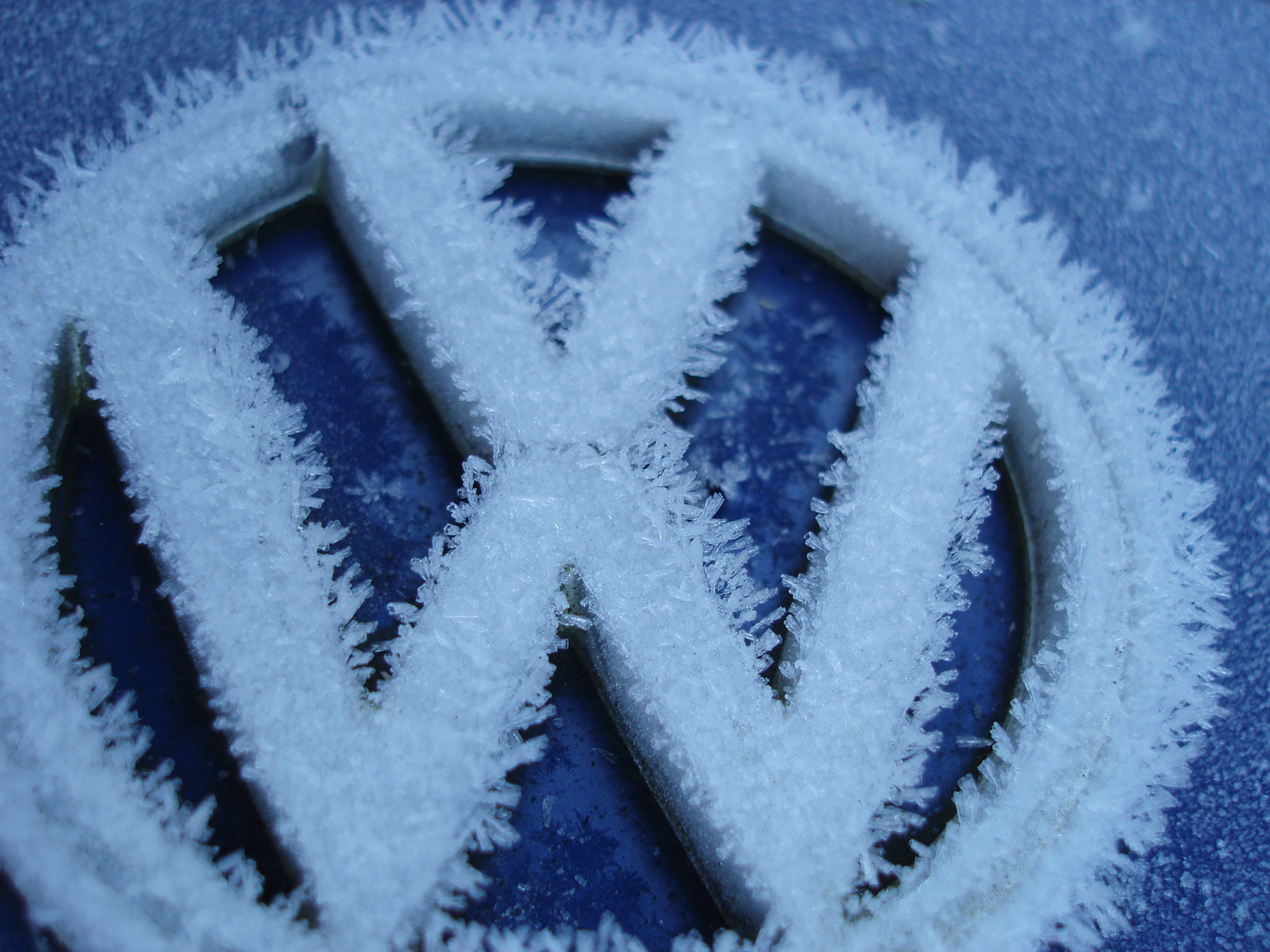 frost crystals growing on the VW badge of a classic car