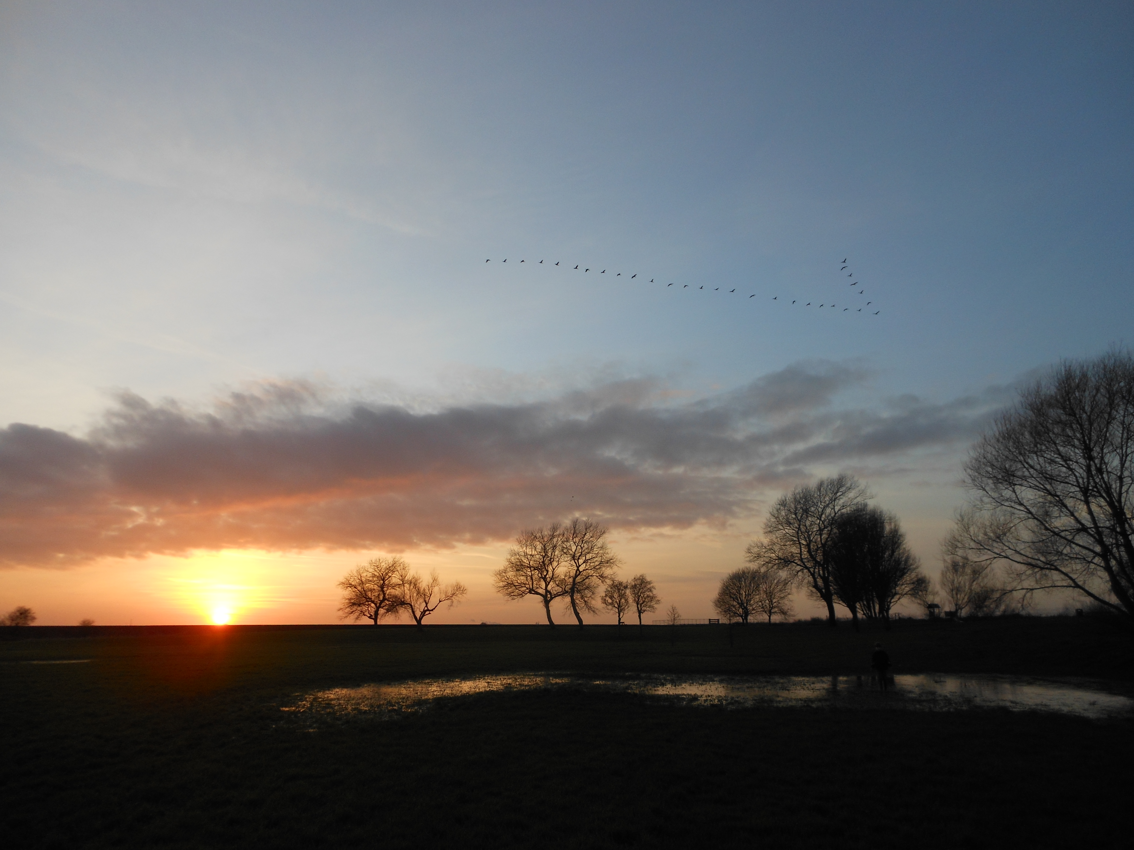 The Broads in Norfolk UK frozen sunset in December with migrating bird formation