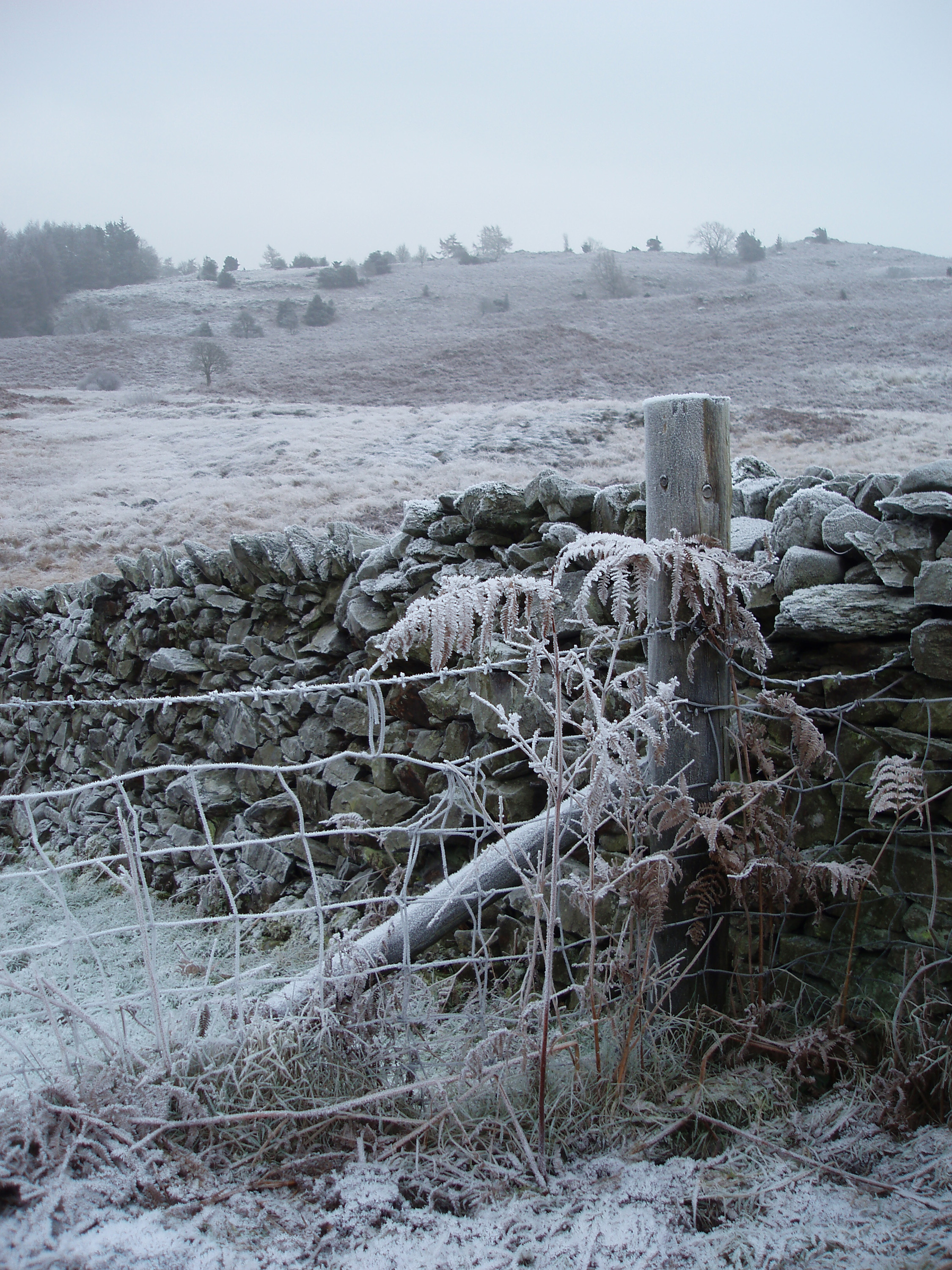 winter scene: a wire fence, stone wall and frozen common