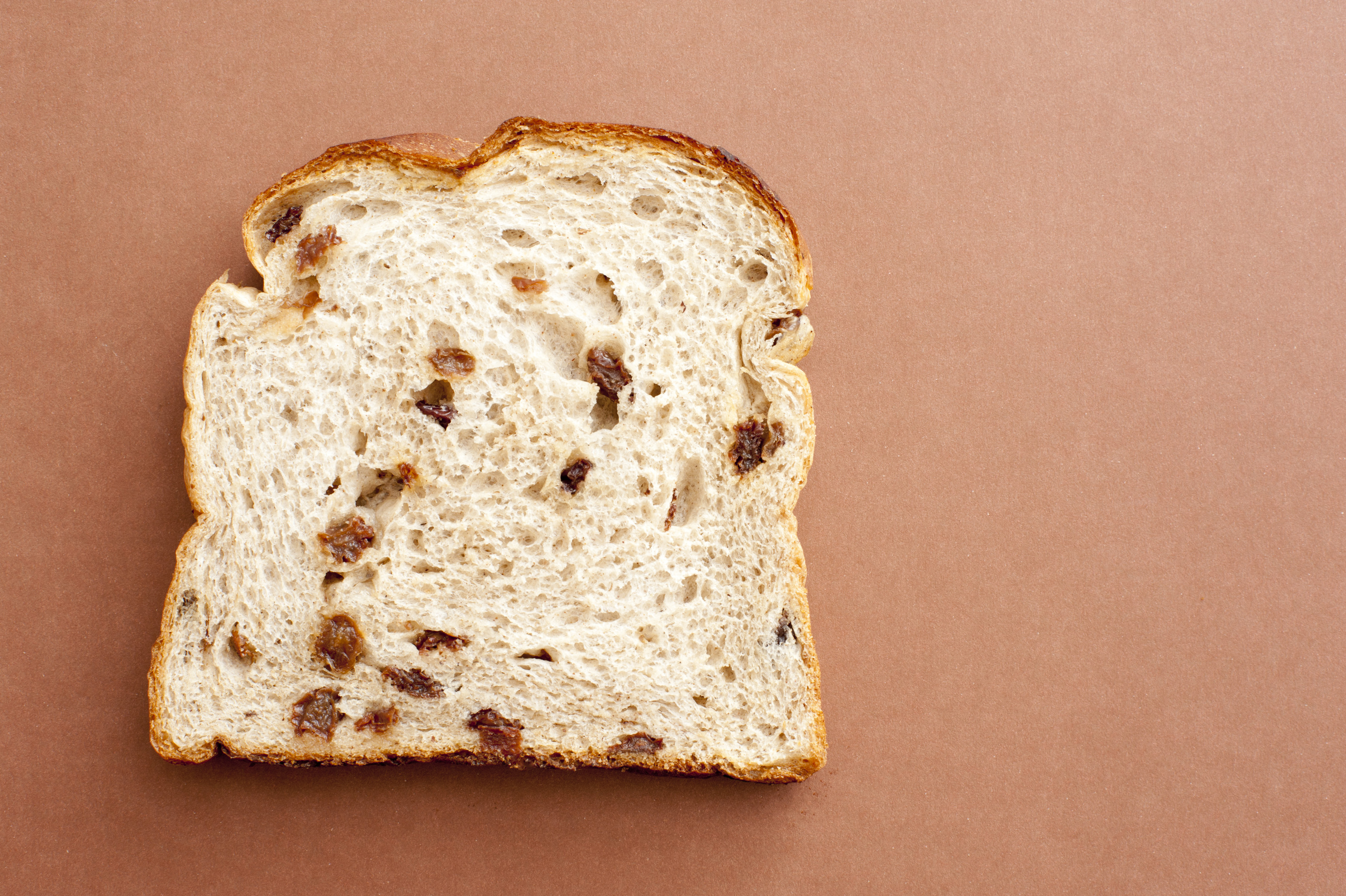 Keywords: baking, bread, food, fruit, overhead, raisin, slice, white, breakfast, plain, background, brown, copyspace, carbohydrate, nutrition