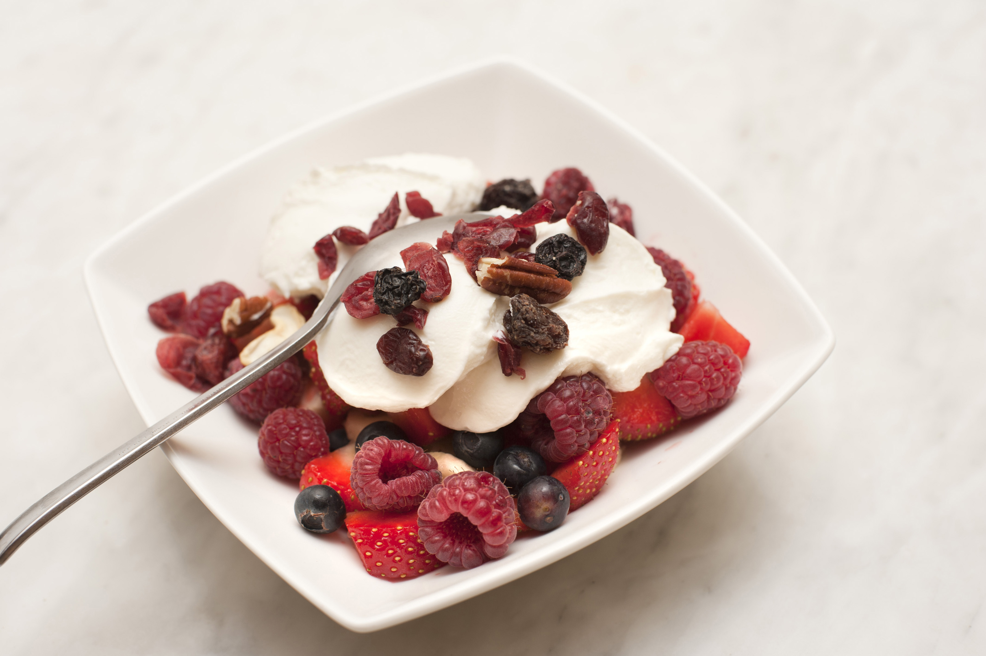 Keywords: breakfast, fresh, fruit, nutritious, plate, raisins, raspberries, strawberries, yogurt, blueberries, healthy