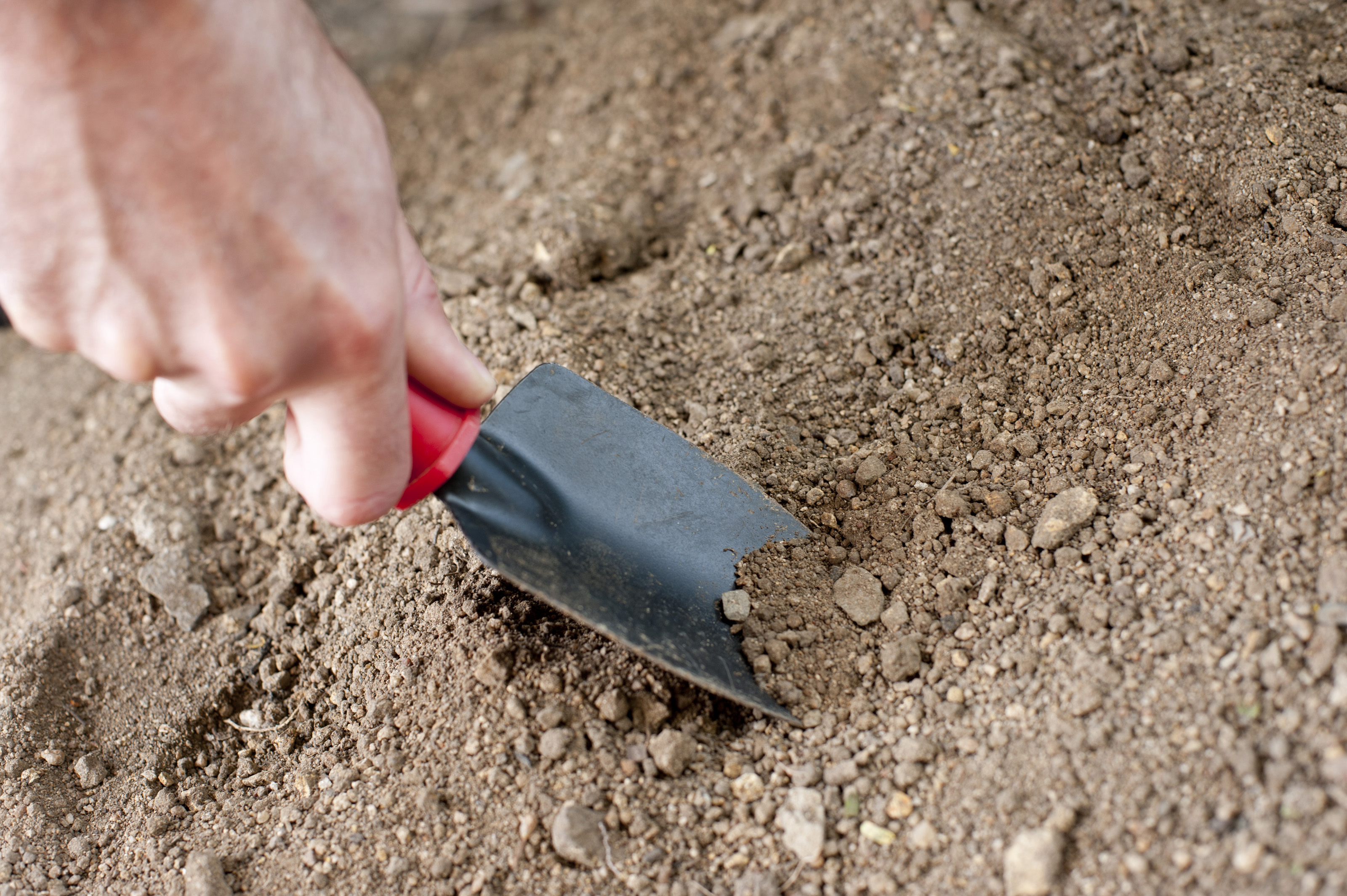 Man preparing a seedbed in the garden digging it over with a trowel before planting, close up view of his hand and the trowel