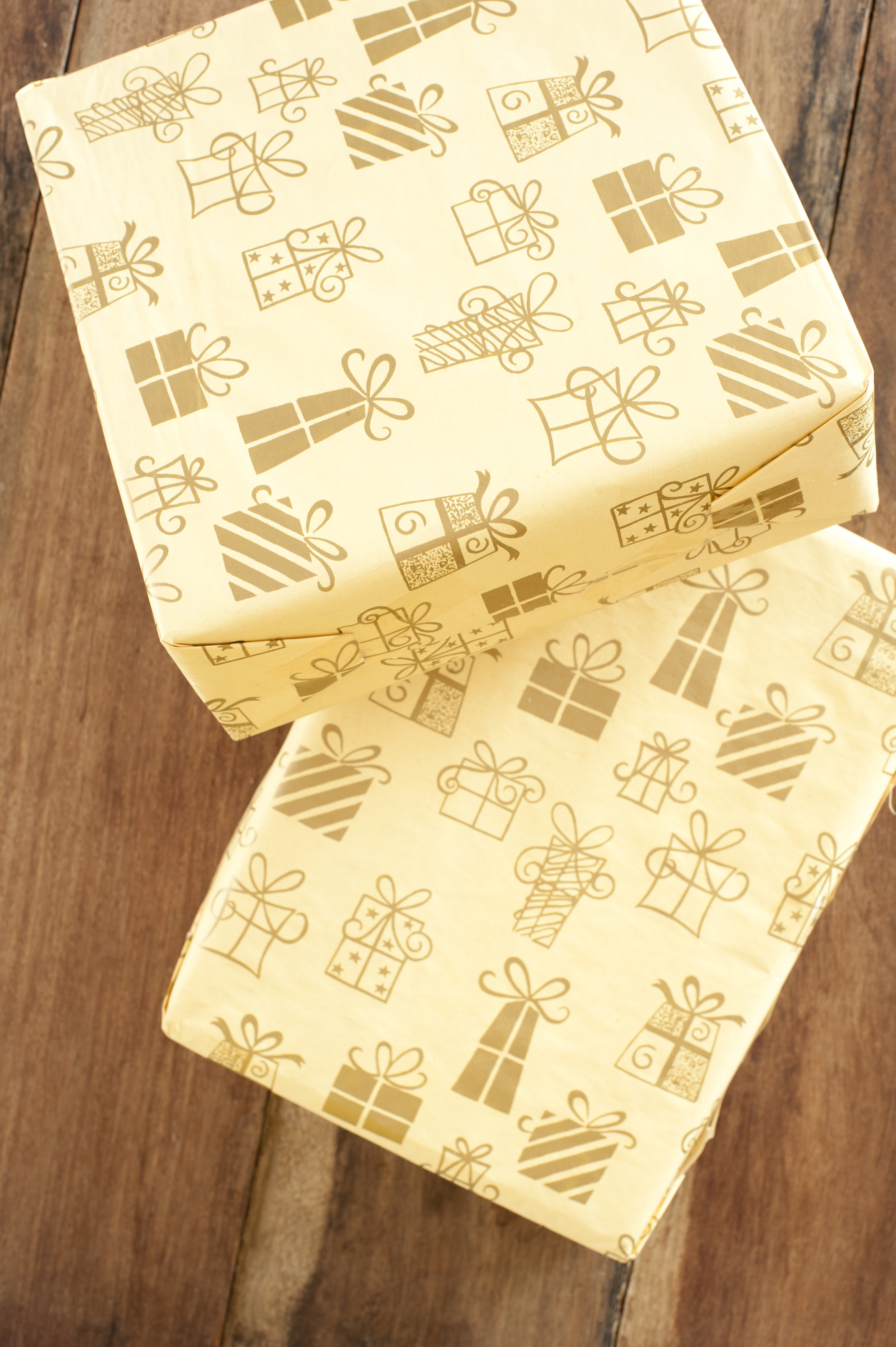 Two gift-wrapped party gifts in pretty decorative cream colored paper with a generic pattern of different gift boxes viewed from above on a wood background