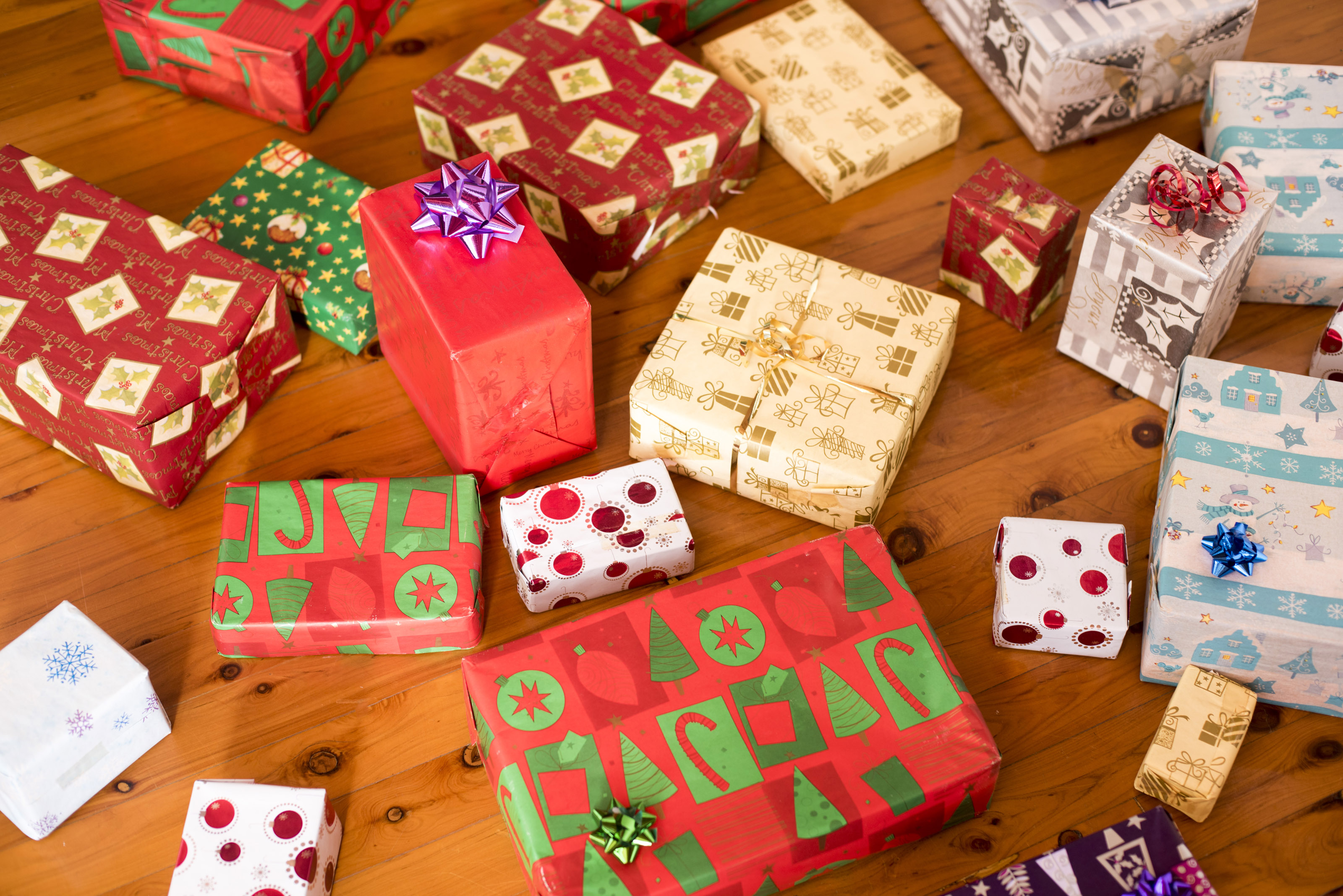 17215 Various Christmas presents on timber floor - this image by christmashat is licensed under a Creative Commons Attribution 3.0 Unported License.