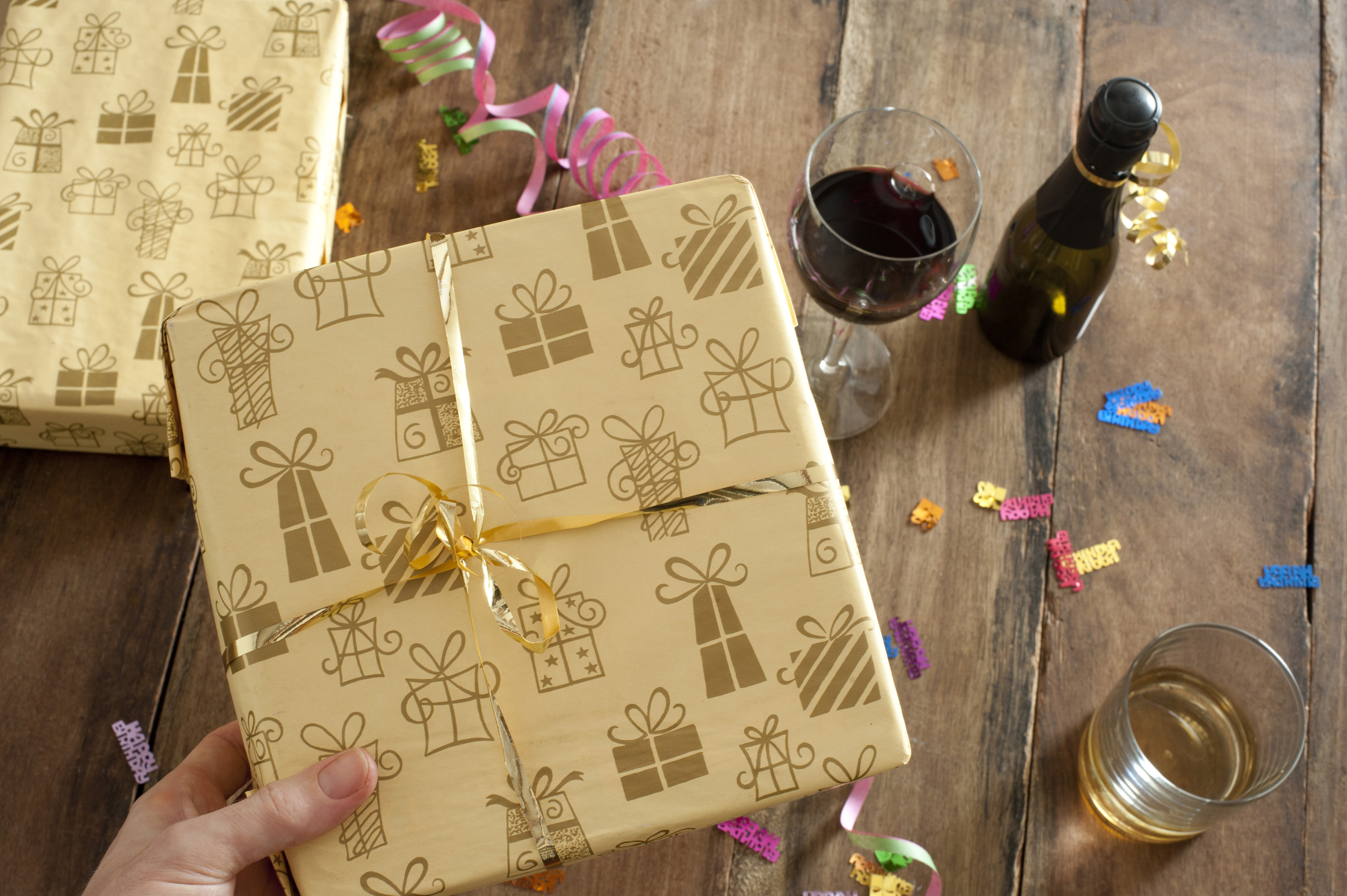 Keywords: celebration, confetti, fun, gift, paper, party, present, ribbons, table, wrapped, wrapping, glass, hand, wine, bottle, holding, giving