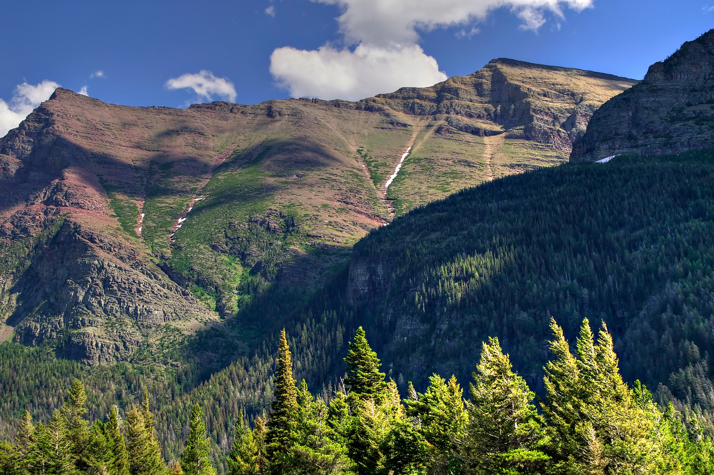 Keywords: Glacier, National, Park, mountain, high, ridge, shadows, blue, sky, clouds, peak, trees, forest, pine, HDR