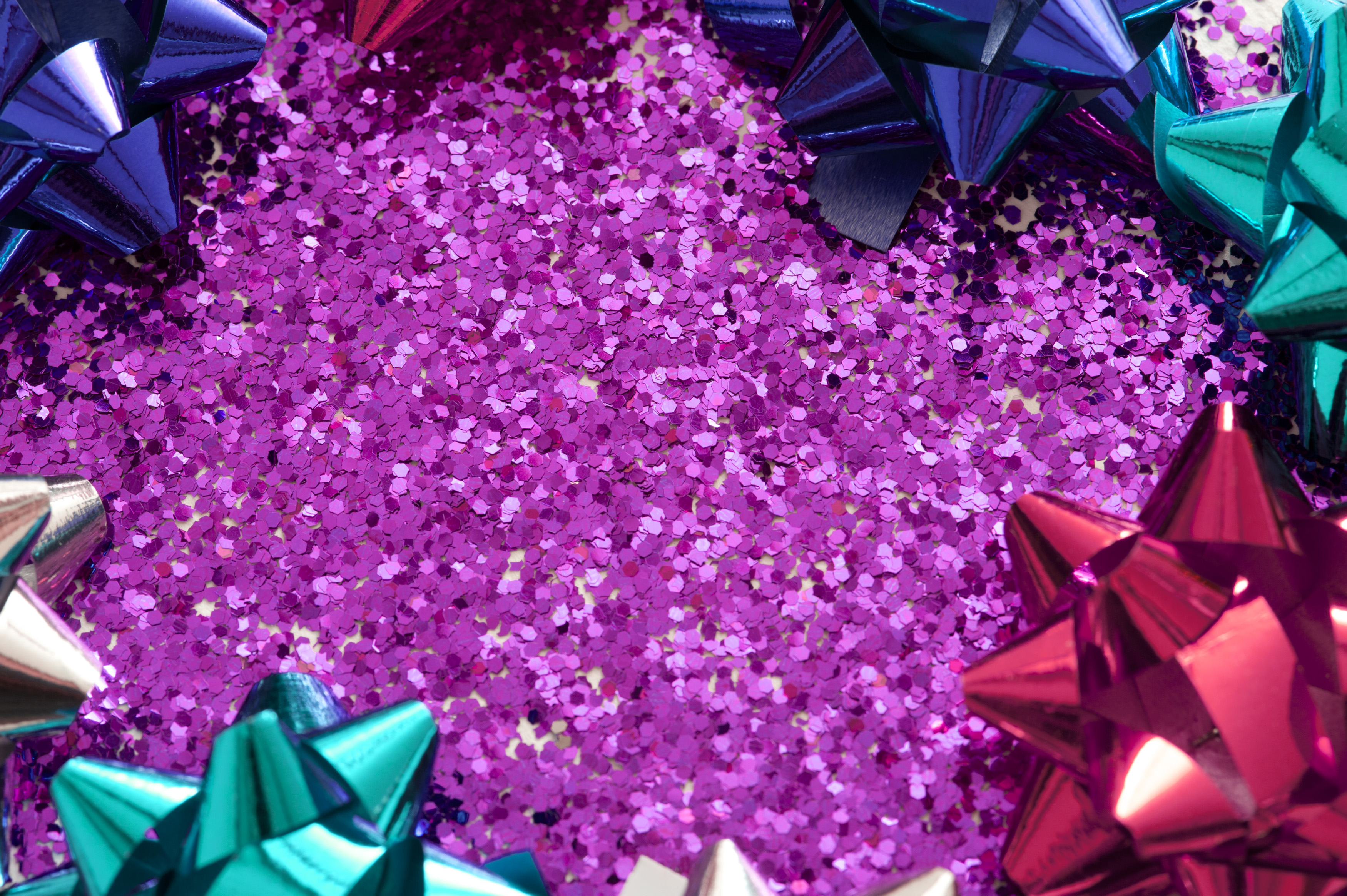 a festive background with space for text on pink glitter with brapping bows around