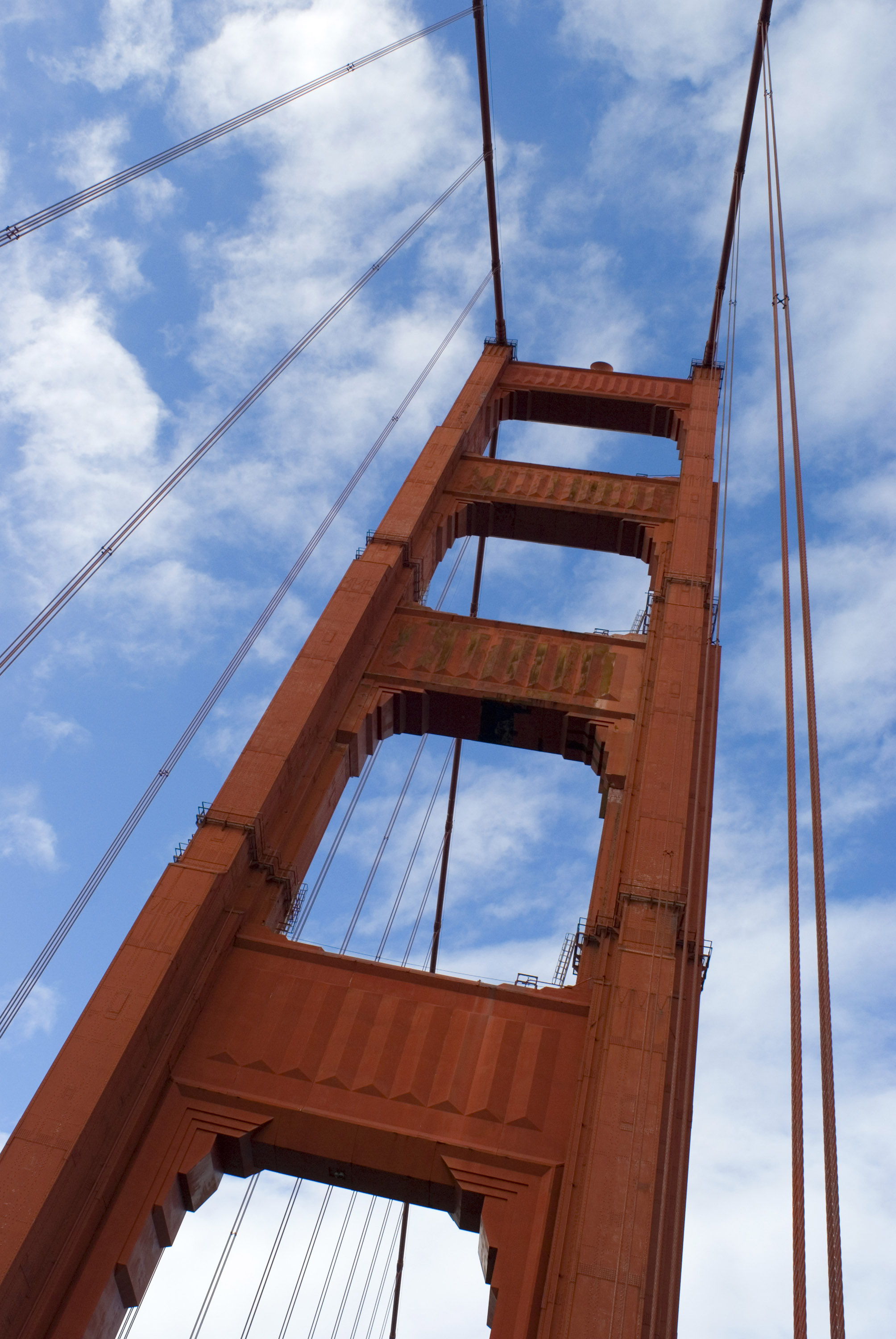 Keywords: suspension cable towers, low angle, metal, golden gate bridge, san francisco, detail, close up, tall, high, supporting, support, strength