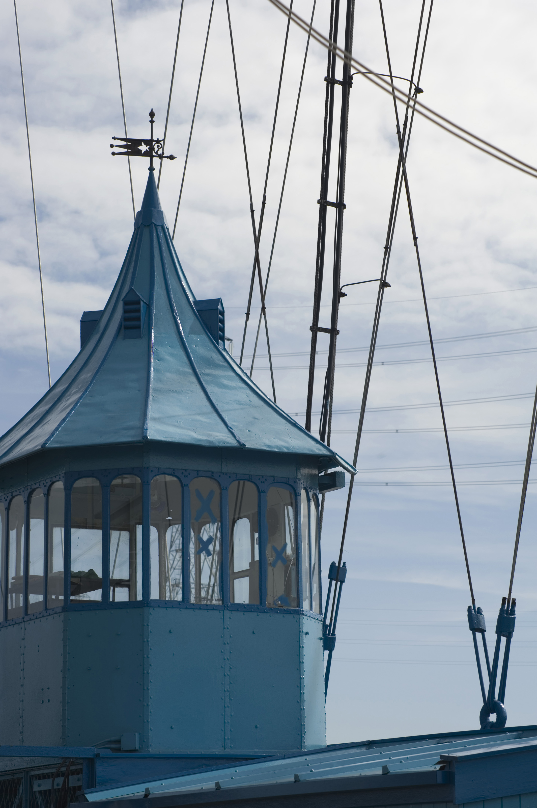 Keywords: metal, blue, travel, transport, platform, historic, structure, steel, room, landmark, bridge, control, conical, wales, gondola, octagonal, welsh, newport, transporter bridge, pont gludo casnewydd