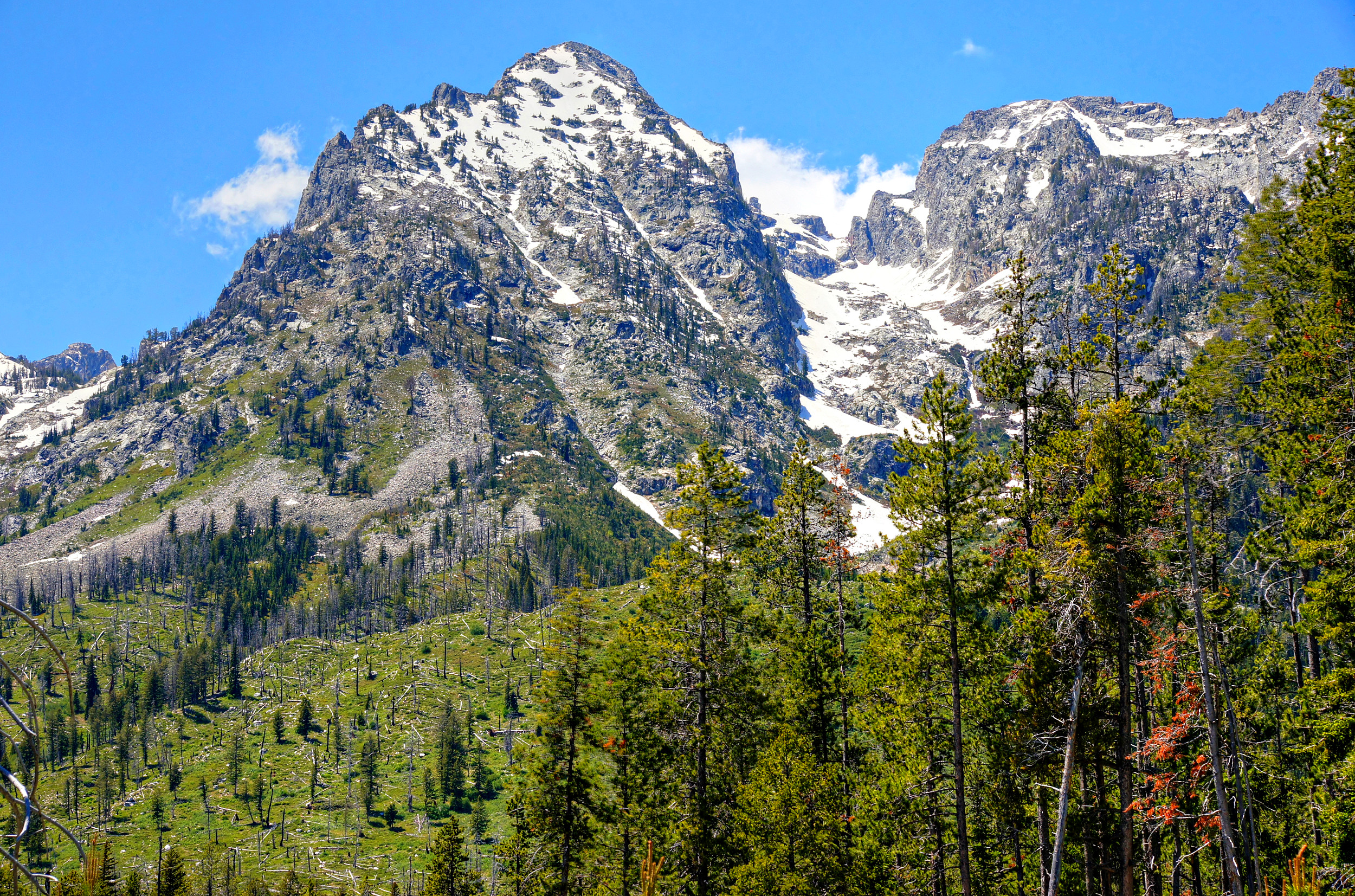 Keywords: Grand,Teton,National,Park,Jackson Hole,valley,range,peak,mountains,snow,major,Mount,Owen,Yellowstone,Wyoming,Snake,River,Jackson,Jenny,Emma, Matilda,Two Oceans,Lakes,waterfalls,Hidded,Falls,glaciers,jagged,brush,trail,Rockefeller,Memorial,Parkway,dam,blue,trees,skies,sky,forests,forested,slope,clouds,cloudy,high,altitude,sun,sunshine,leaves,vertical,branches,Leigh,Bradley,Taggart,Phelps