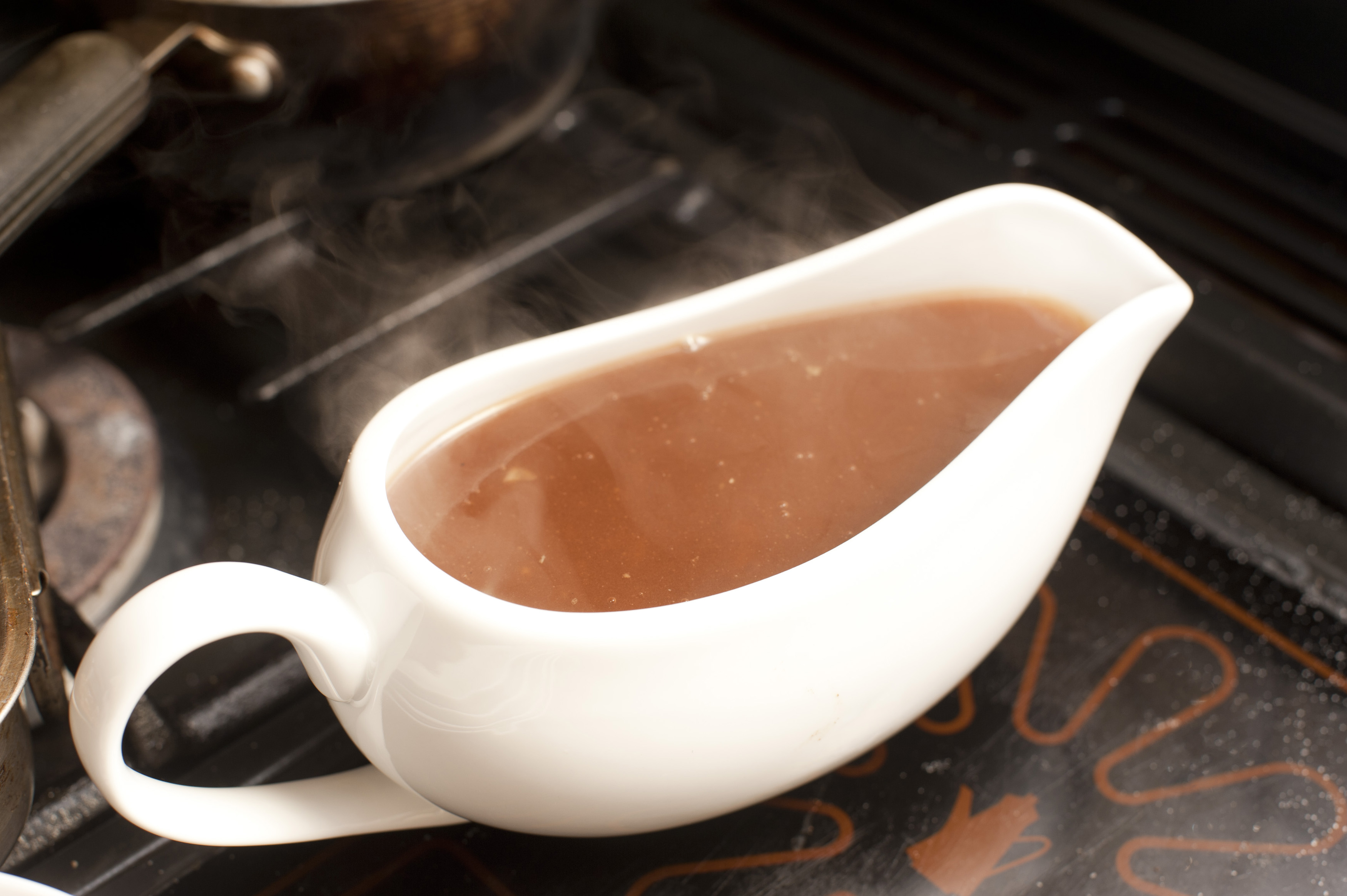 Gravy boat filled with rich hot gravy made from meat drippings and stock standing on a warming plate
