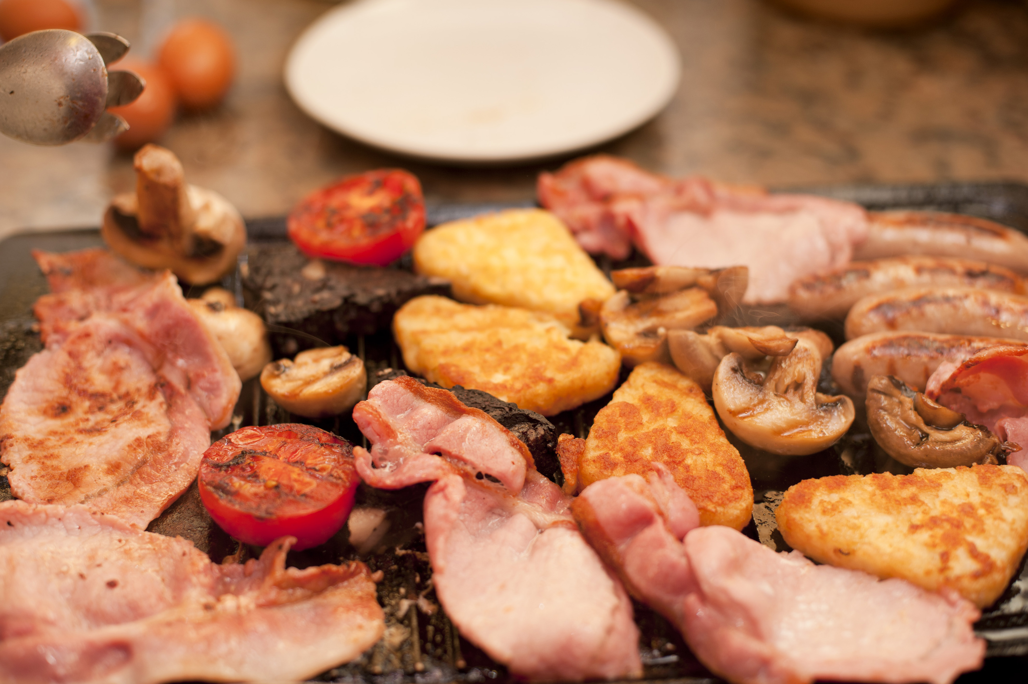 13010 Wholesome English breakfast on the griddle - this image by freefoodphotos is licensed under a Creative Commons Attribution 3.0 Unported License.