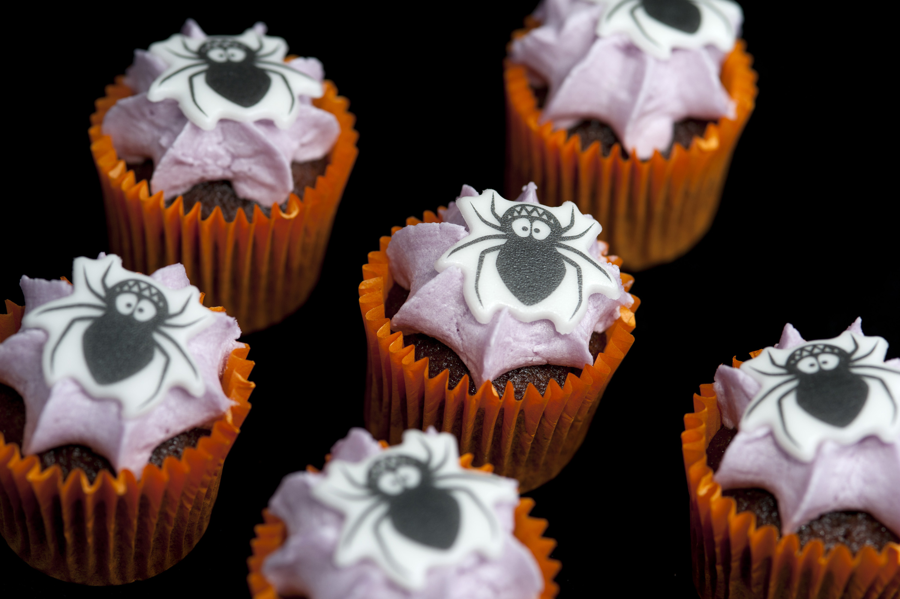 Keywords: halloween, trick or treat, cake, many, multiple, spiders, iced, decorated, fin, spooky, creepy, party, icing, frosting, chocolate, black