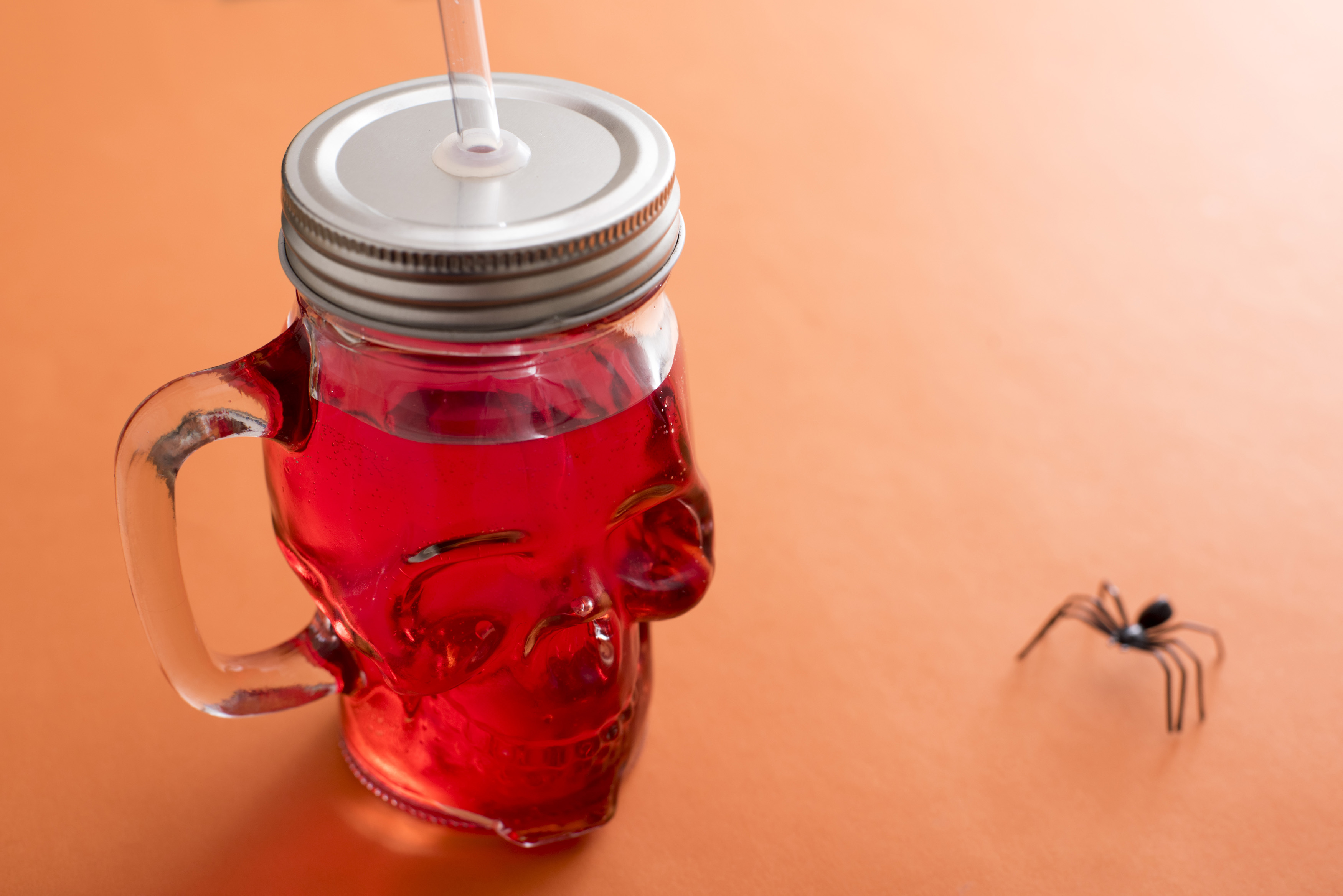 Keywords: childhood, copy space, creepy, drink, fun, glass, halloween, near, objects, red, scary, spider, spooky, bright, liquid, juice, cordial, straw, orange, mason jar