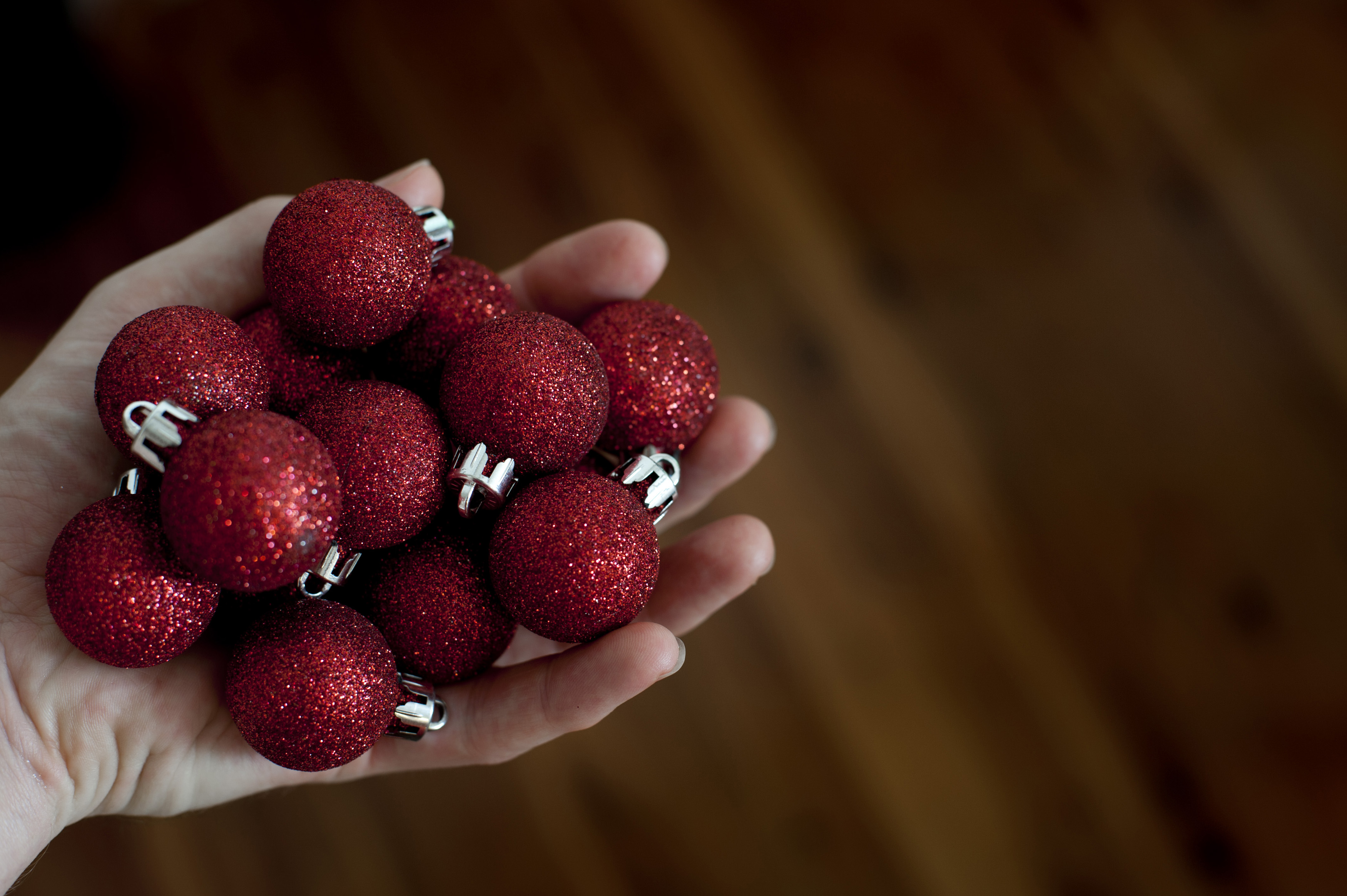 Keywords: christmas, decoration, holiday, xmas, celebration, seasonal, bauble, ball, copyspace, handful, holding, man, red, wood, background