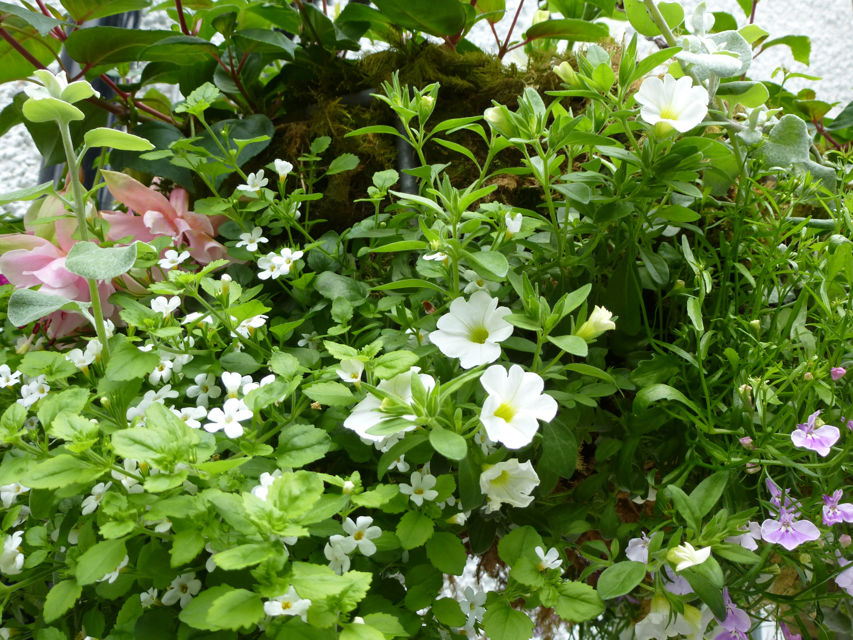 Keywords: delicate, flowers, garden, pink, plants, pretty, purple, white, green, background, hanging basket