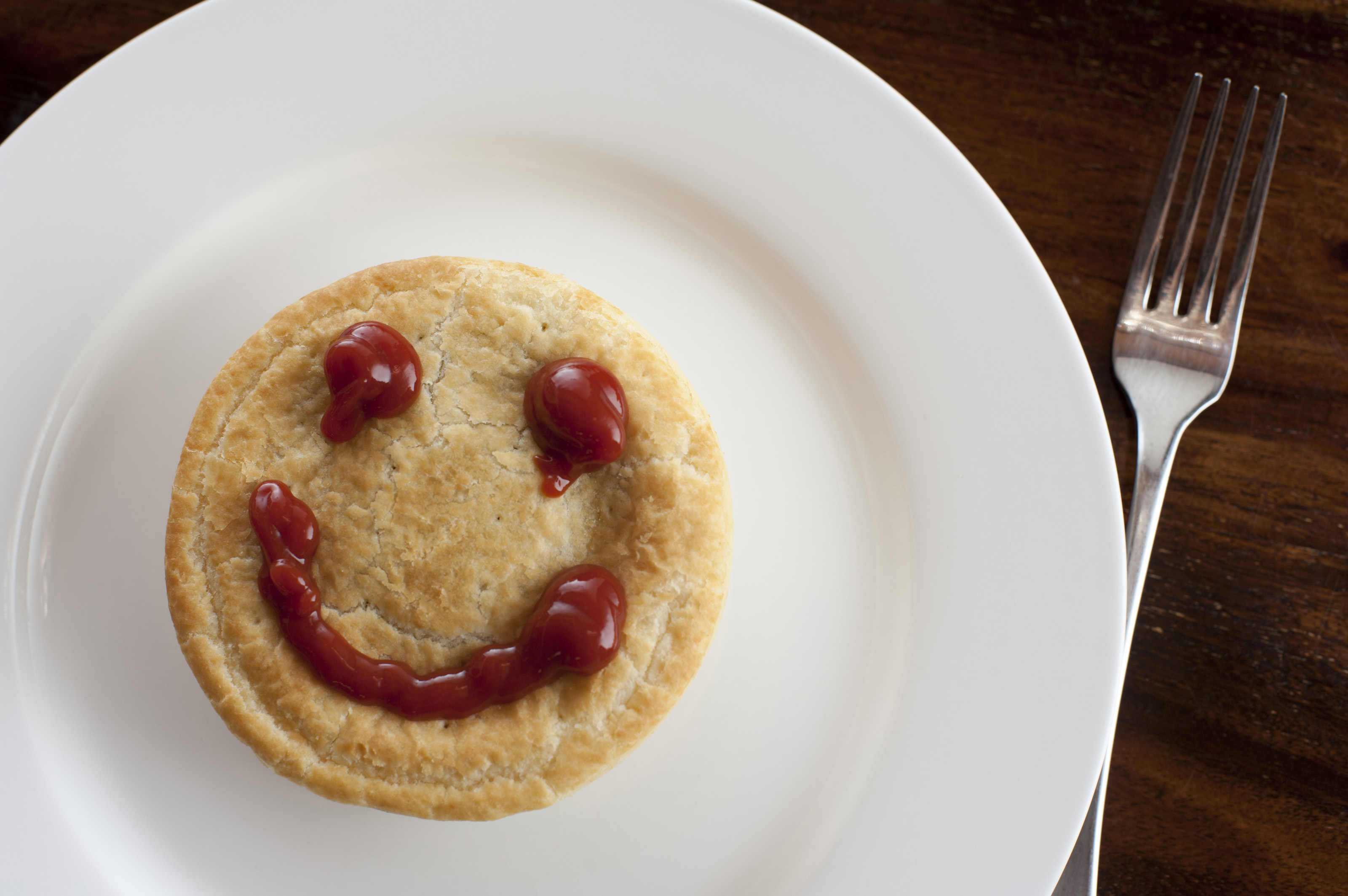 Keywords: food, funny, happy face, plate, white, face, happy, ketchup, meat pie, pie, pie face, sauce, smile, tomato sauce