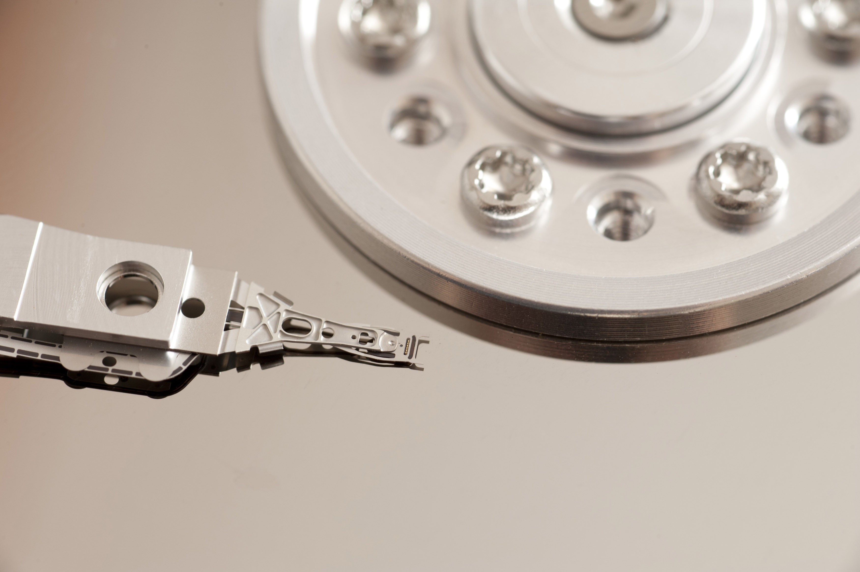 Close-up view of shiny metal hard disk drive reading head near disk mount with screws