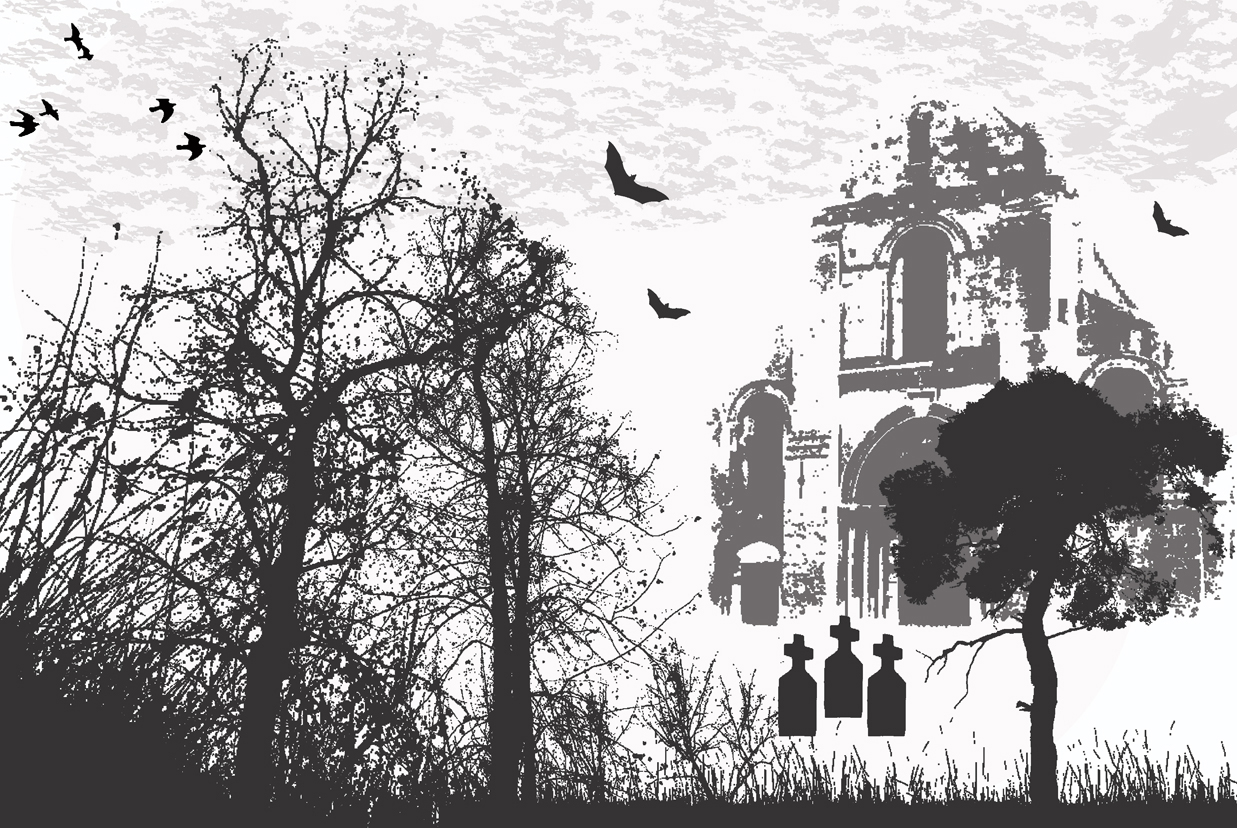 Keywords: Haunted, Vector, black, trees, cemetery, graves, stone, headstone, bats, birds, crows, castle, clouds, woods, forest, chilling, scary, fly, leaves, grass, white, grey