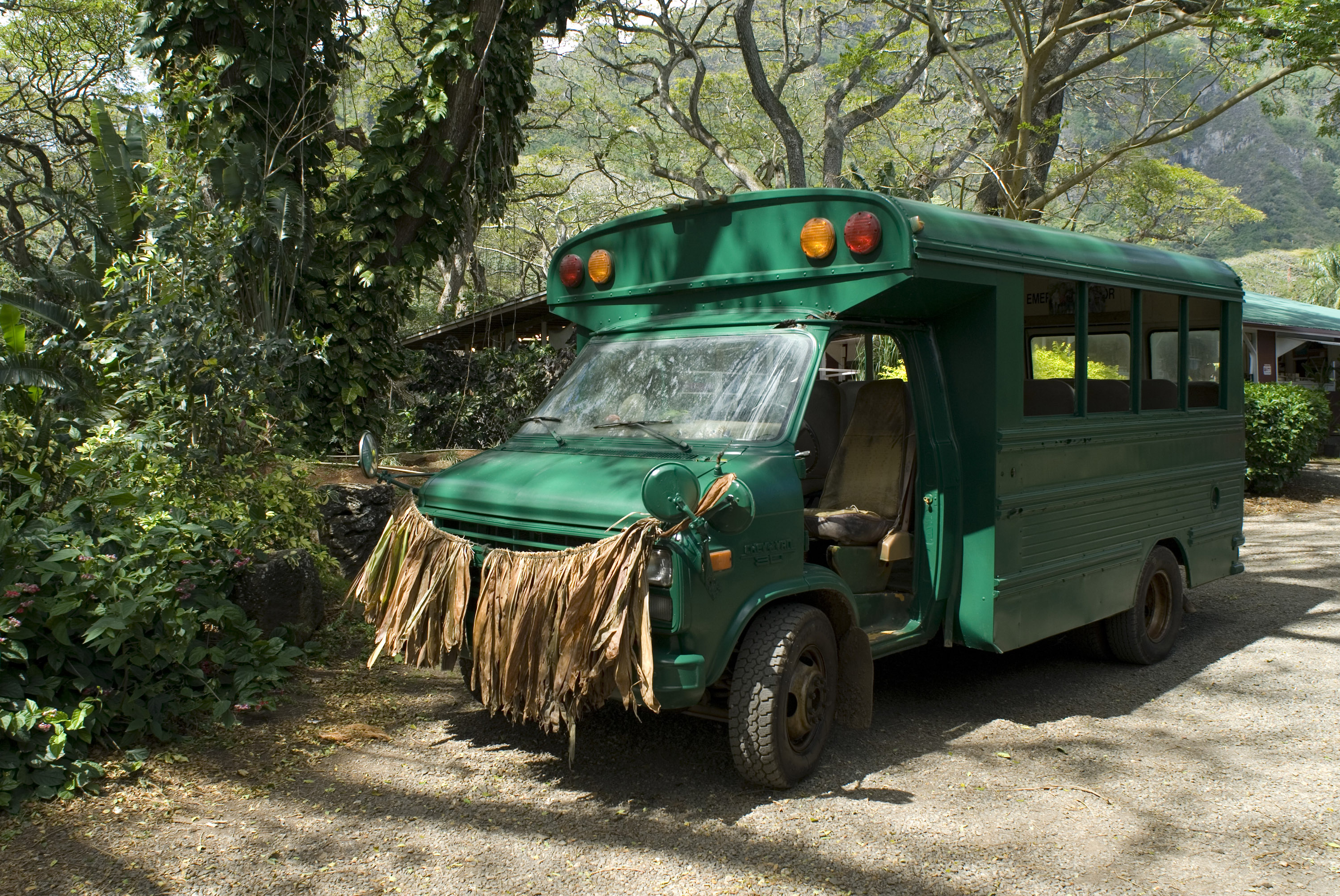 A green pained school bus with a grass skirt, Oahu, Hawaii, USA