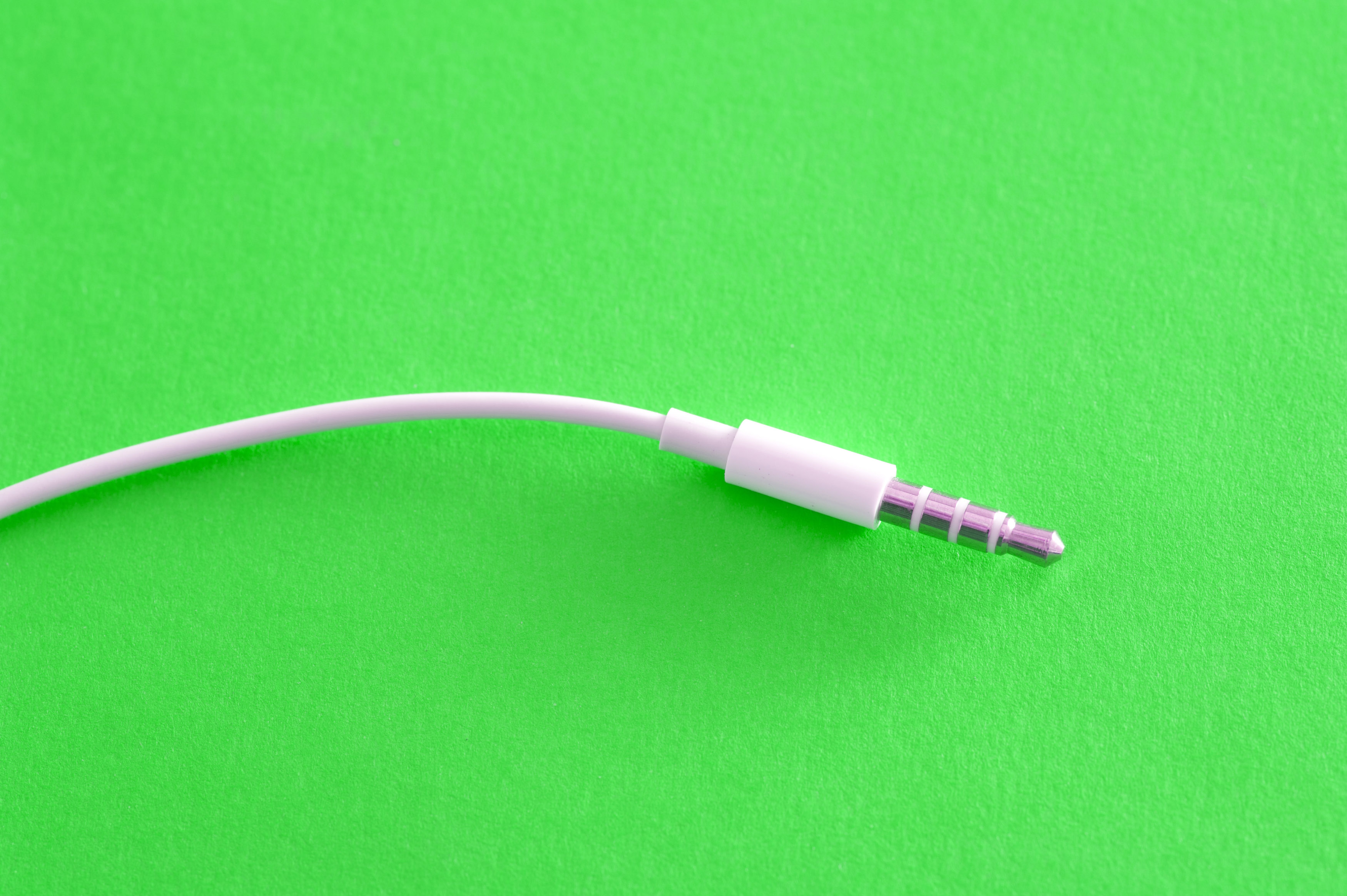 Keywords: electronics, close-up, earphones, headphones, jack, mini, plug, stereo, wire, plastic, connector, audio, macro, green background, white, minimal, minimalist